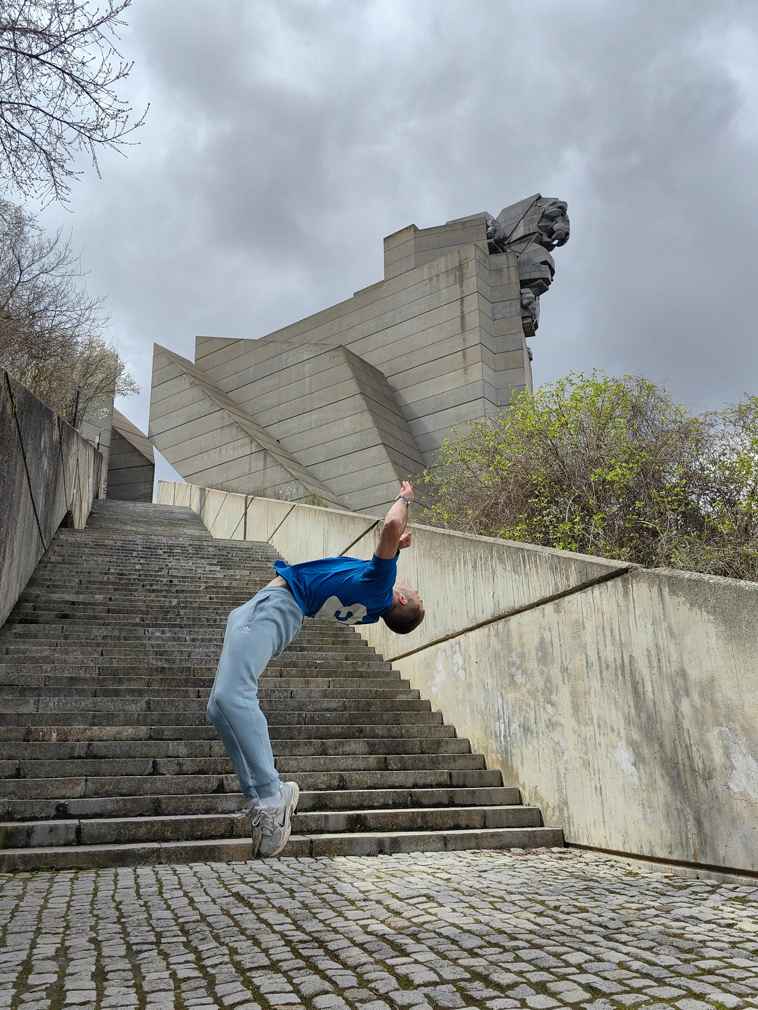 A man in a blue T-shirt and light blue sweatpants is performing a backflip on the steps leading to the Monument to 1300 Years of Bulgaria in Shumen, Bulgaria. The monument is a large, abstract concret…read more