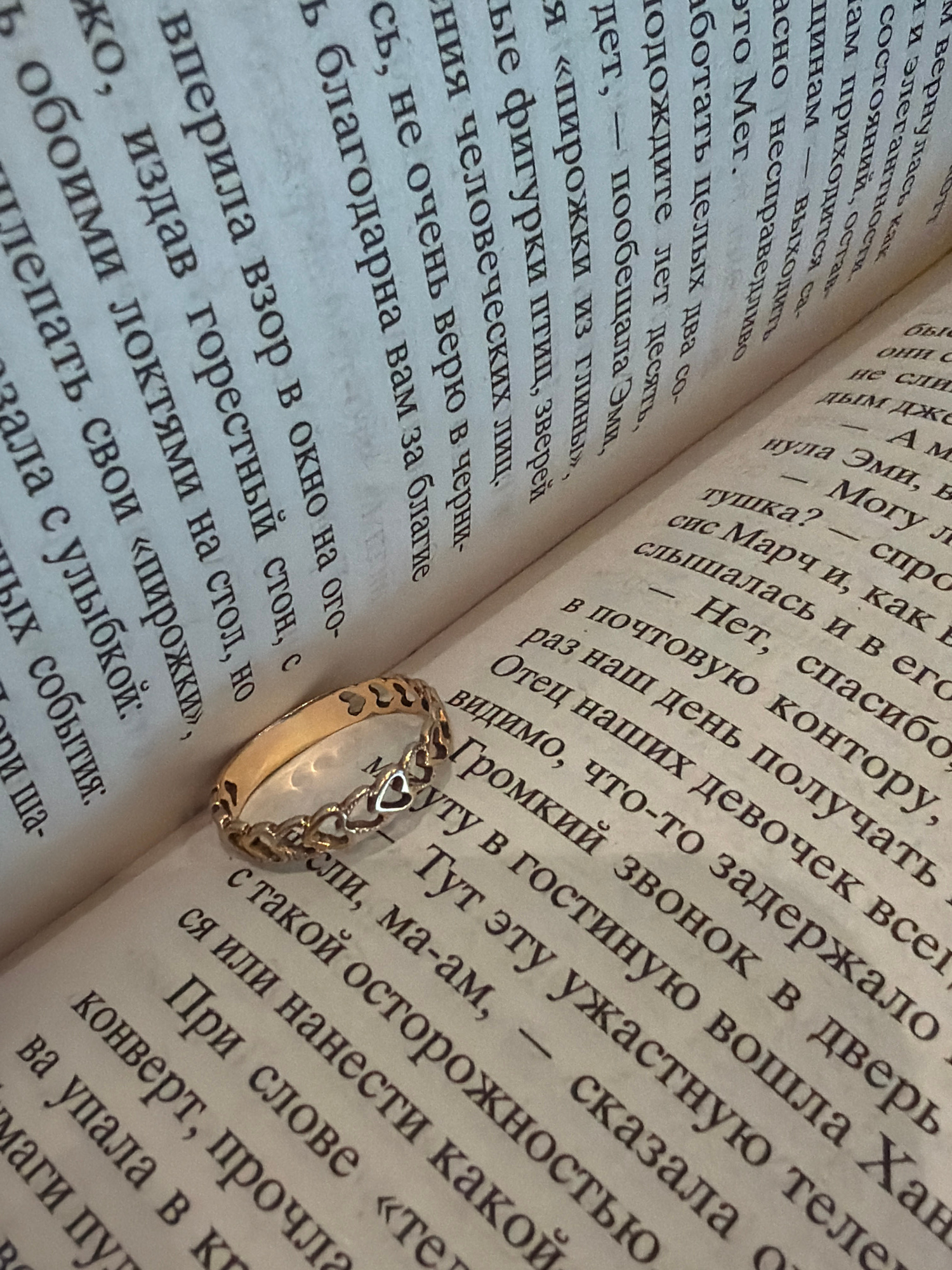 A close-up shot depicts an open book with a gold ring resting on its pages. The ring has a decorative design featuring small hearts. The book's pages are filled with text in a Cyrillic alphabet. The p…read more