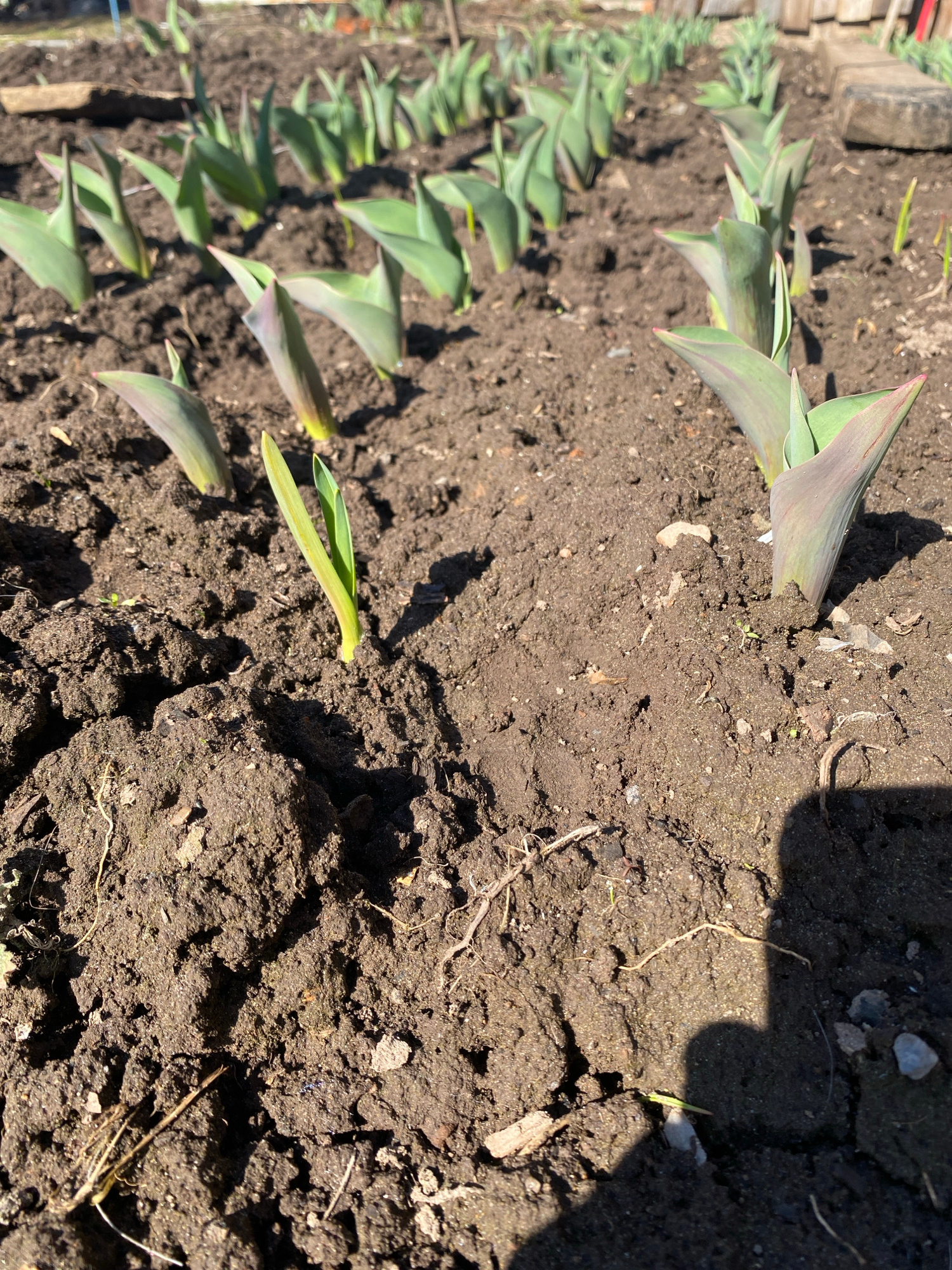 The image shows a row of young tulip plants emerging from dark brown soil. The leaves are green with some exhibiting reddish or purplish edges, suggesting a particular cultivar. The plants are lined u…read more