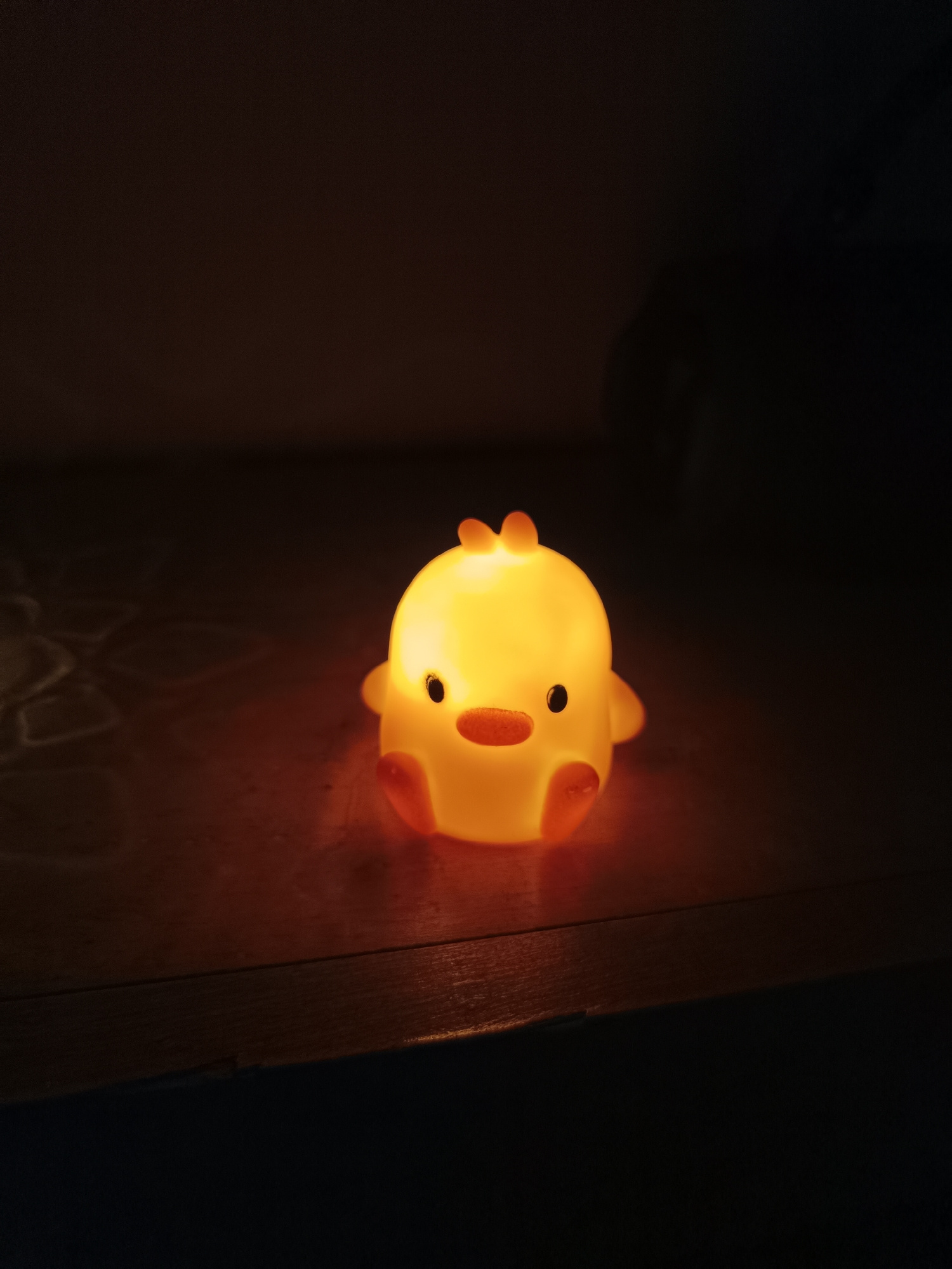A softly glowing, yellow chick-shaped night light is positioned on a dark wooden surface. The room is dimly lit, casting the rest of the scene in near darkness. There are no people present. The settin…read more