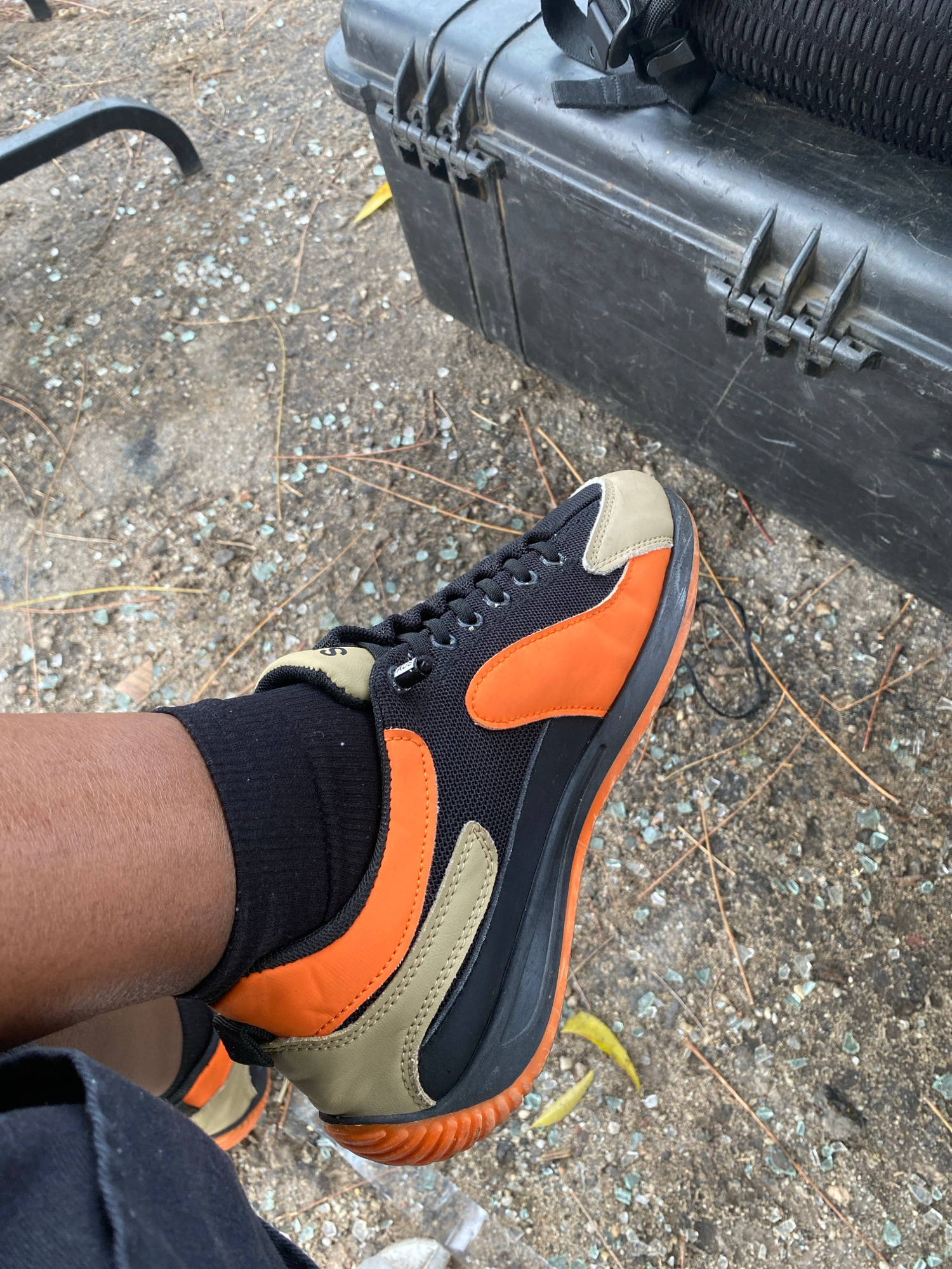 The image shows a person sitting outside, possibly in Lagos, Nigeria, with a black hard case or toolbox next to them. The person is wearing black socks and black pants, with orange, beige, and black s…read more