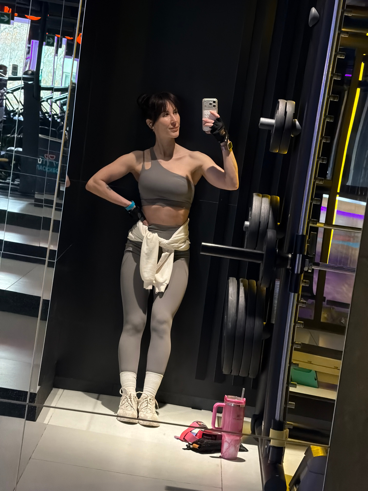 A young woman stands in what appears to be a modern gym or fitness center. She is dressed in athletic wear, consisting of a grey sports bra, matching grey leggings, white ankle socks, and light-colore…read more