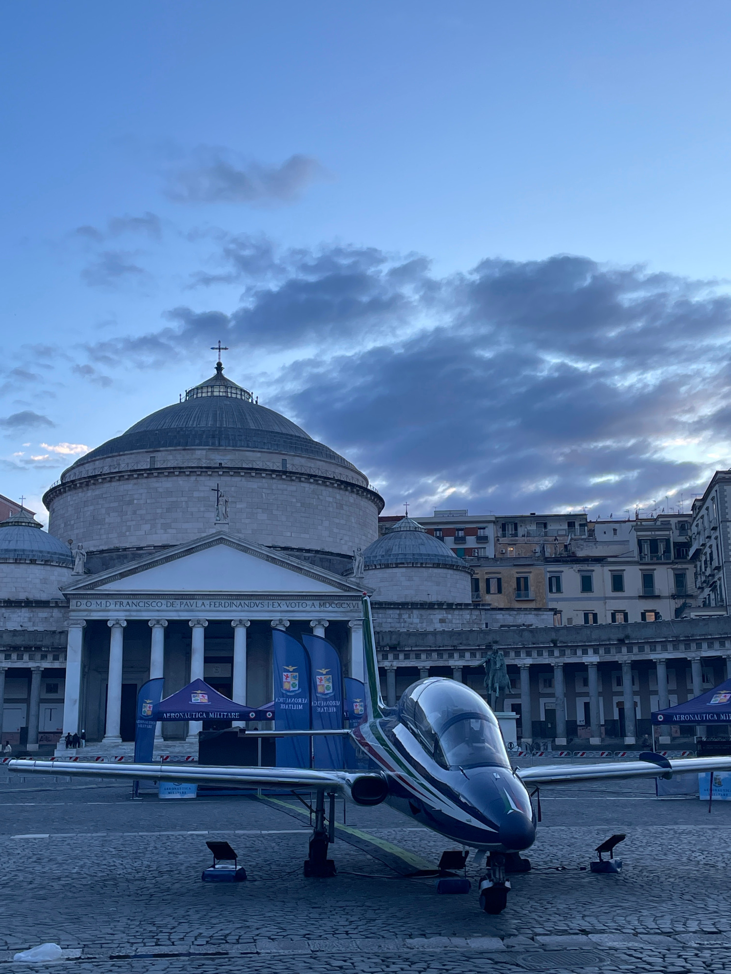 A small, dark blue jet aircraft, adorned with white and green stripes reminiscent of the Italian flag, is parked on a cobblestone plaza in the foreground. The aircraft's wheels are chocked, and a port…read more