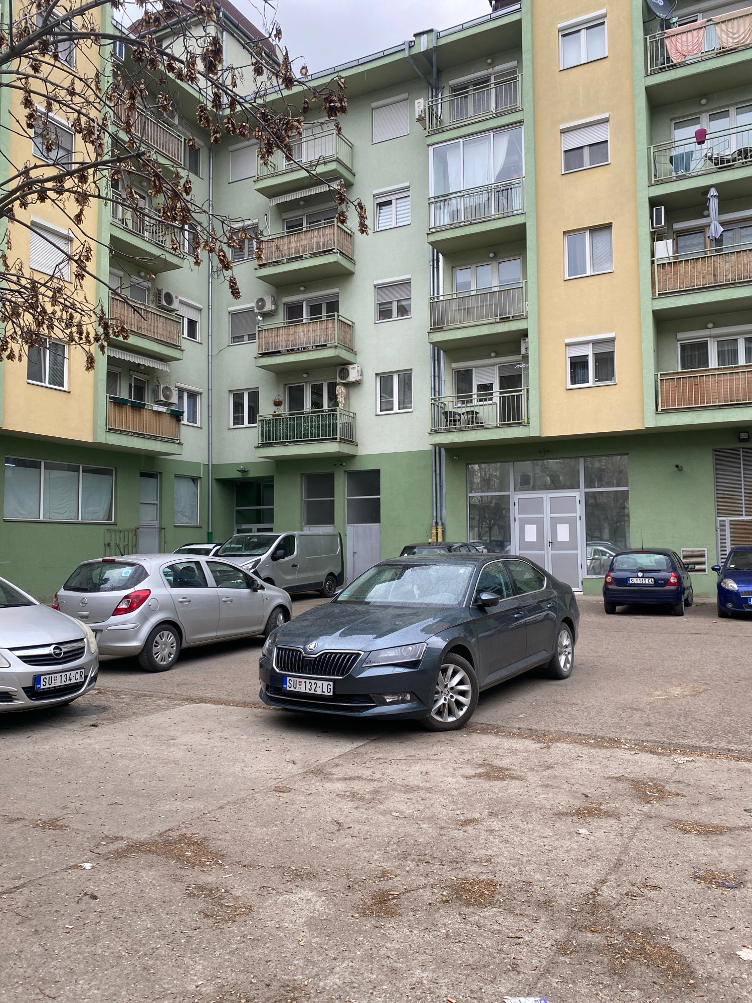The image depicts an outdoor parking area adjacent to a multi-story residential building, likely located in Subotica, Serbia based on the license plates. The building is painted in alternating shades…read more