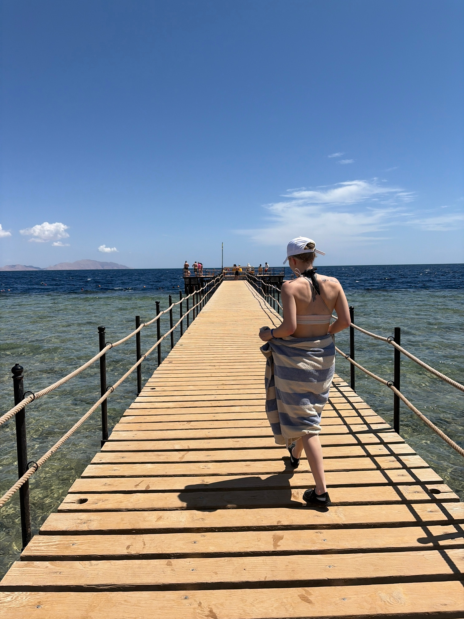 A sunny daytime scene depicts a person walking on a wooden pier extending into the Red Sea in Sharm El Sheikh, Egypt. The main subject, observed from behind, is a person wearing a white baseball cap,…read more