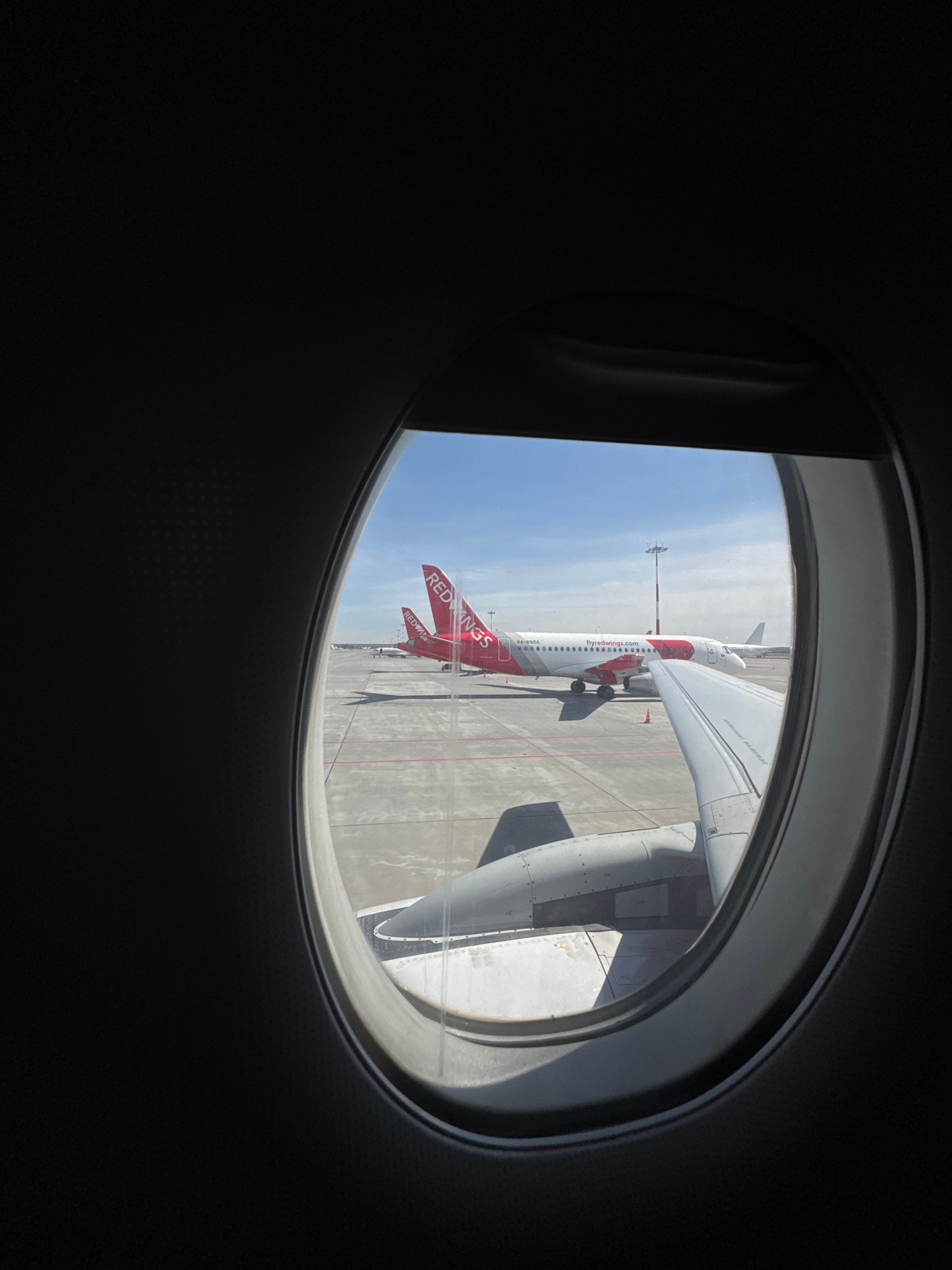 A view through an airplane window reveals a Red Wings aircraft on the tarmac. Another aircraft's wing is visible beside the window. The location is identified as Yekaterinburg, Russia.