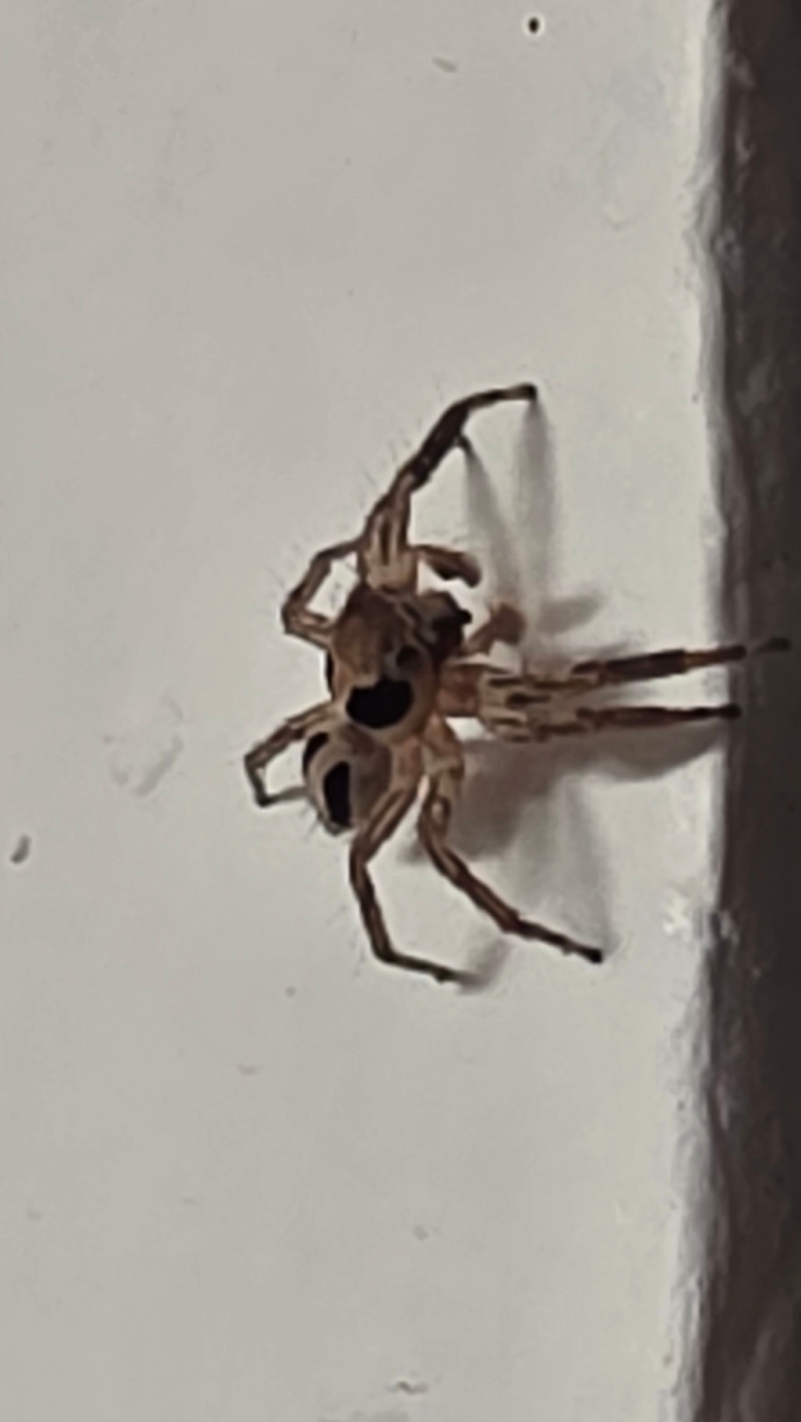 A spider is hanging upside down from a white surface. It is light brown with dark spots and stripes on its legs. The spider's legs are spread out, some touching the surface above. The background is bl…read more