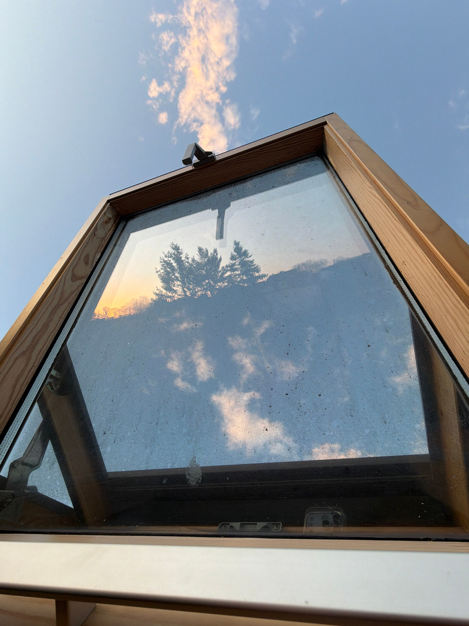 The image shows an open window with a reflection of trees, clouds, and a sunset-like glow on the dirty glass surface. The window frame is made of wood and metal. The scene appears to be shot from a lo…read more