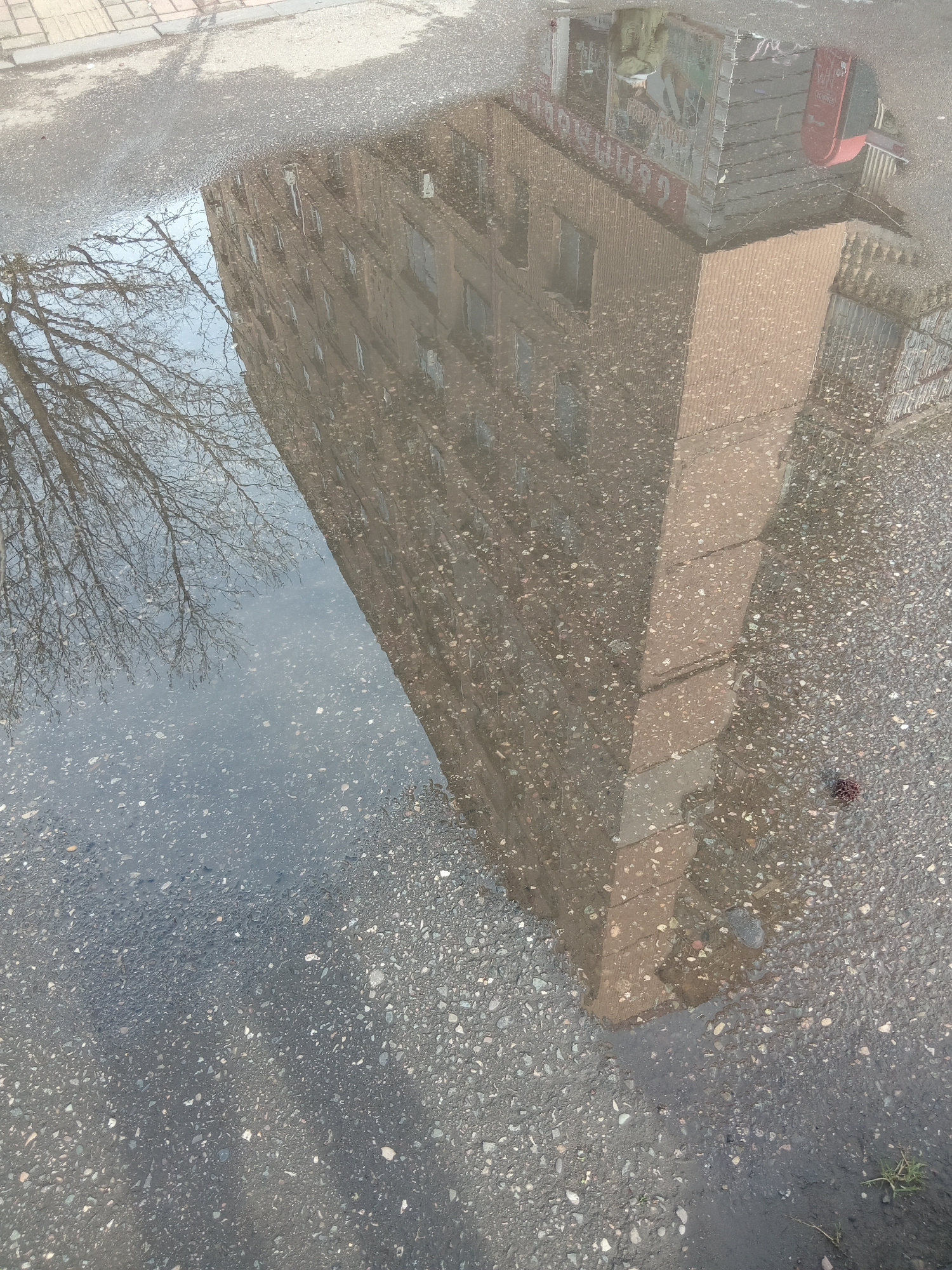 The image shows a puddle reflecting a building and a tree. The building appears to be multi-story, with a brick facade and several windows. A red car is visible near the top of the reflected image. Th…read more