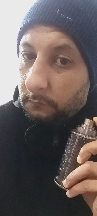 A person wearing a dark blue beanie and a dark jacket is holding a silver BOSS-branded cologne bottle. The person has a beard and is looking directly at the camera with a serious expression. The photo…read more