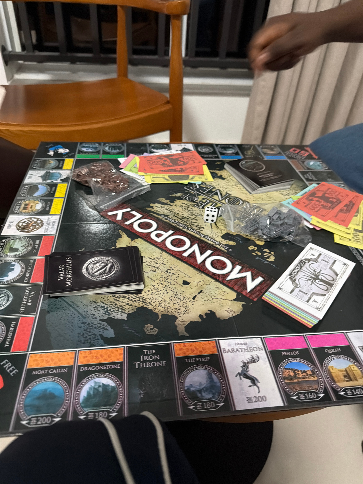 An overhead view captures a Game of Thrones themed Monopoly game in progress indoors in Jiangning District, China. The central focus is the black game board, featuring a map of Westeros and Essos, wit…read more