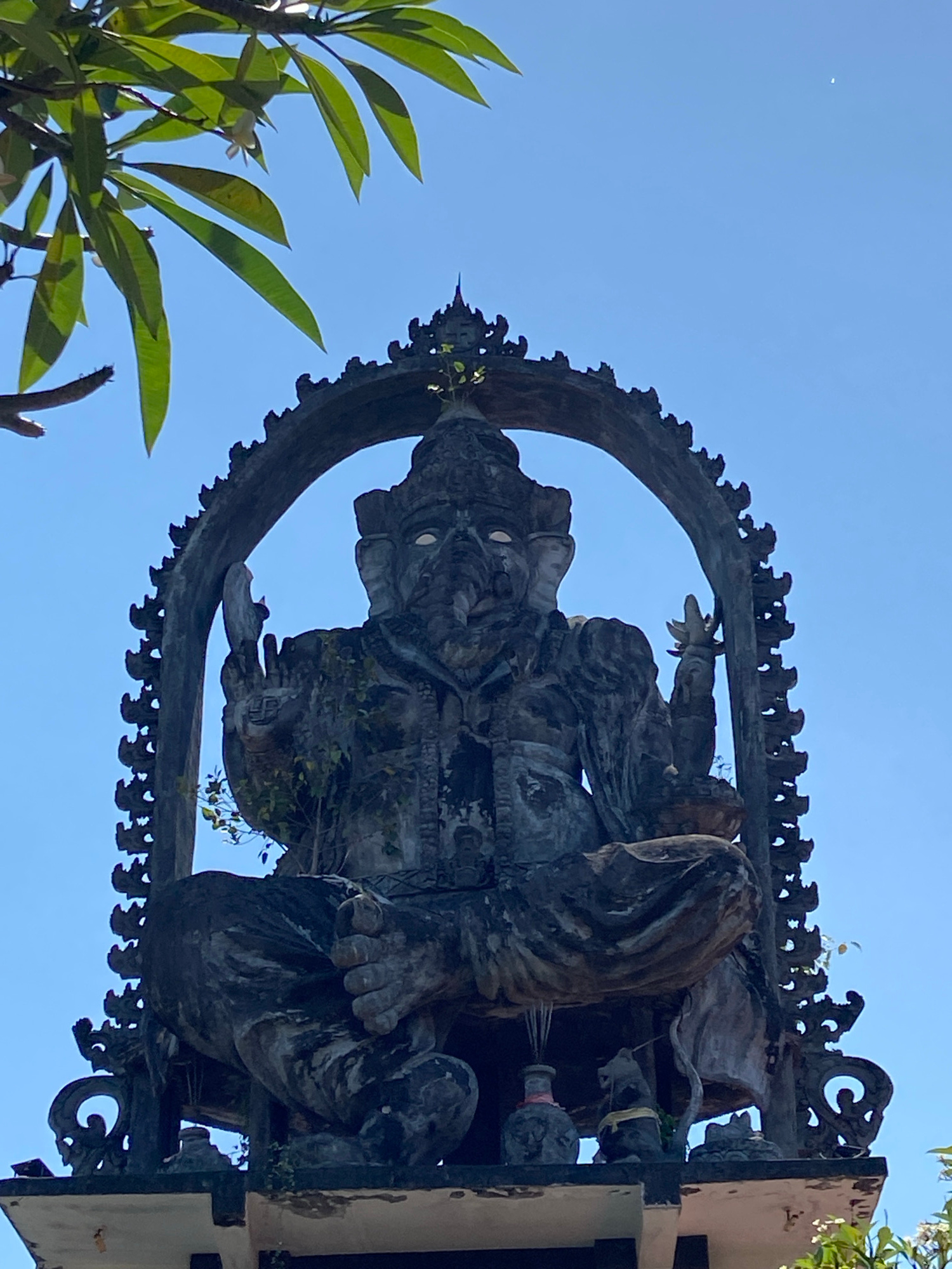 The image depicts a low-angle view of a weathered, stone statue of a deity set against a clear, light blue sky. The statue, possibly a representation of a Hindu god or demon, is framed by an ornate, c…read more