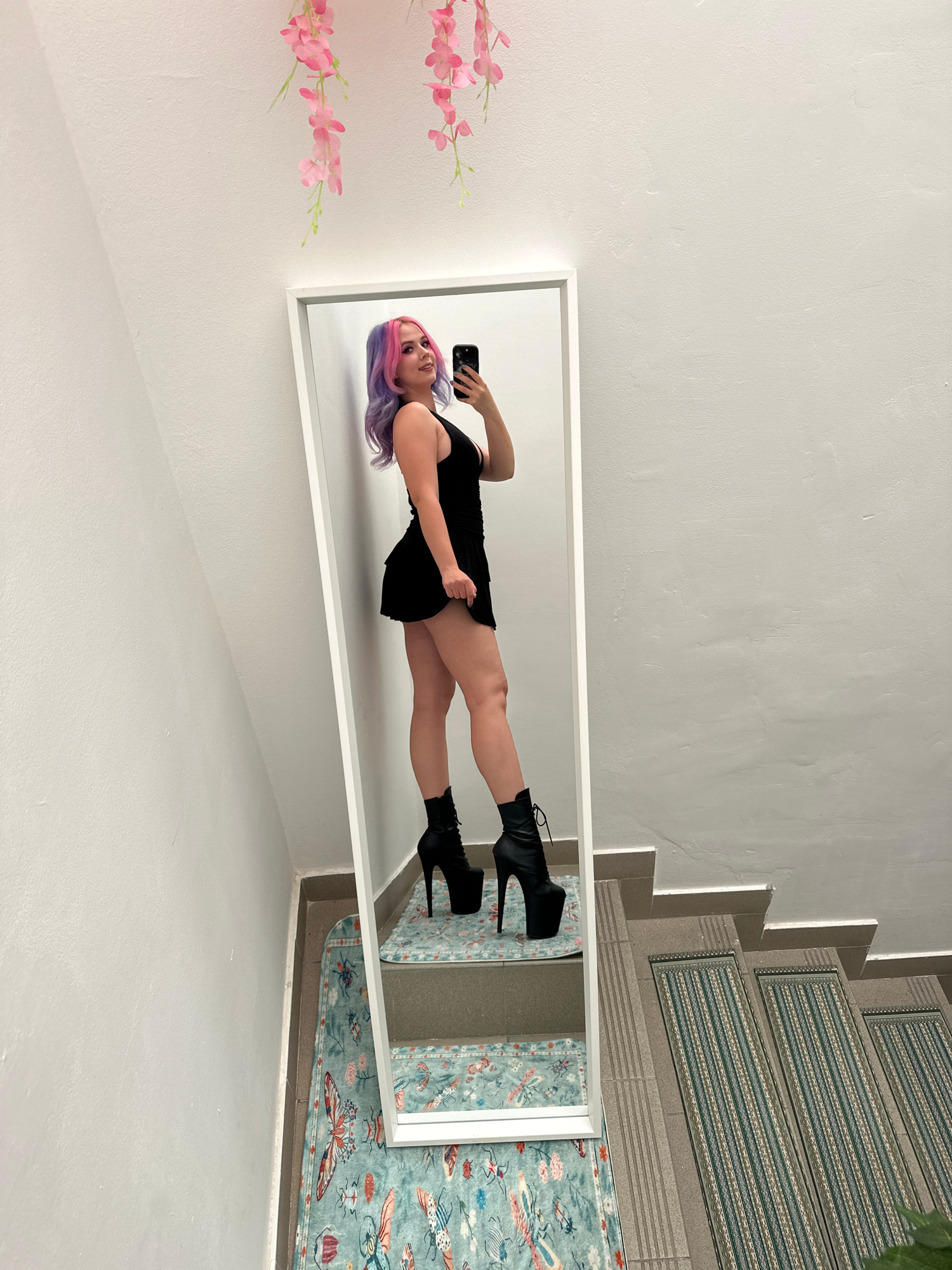 The image captures a full-length mirror selfie taken indoors in the City of Zagreb, Croatia. The photograph itself is rotated 90 degrees clockwise. **Subjects:** The central subject is a person (appe…read more