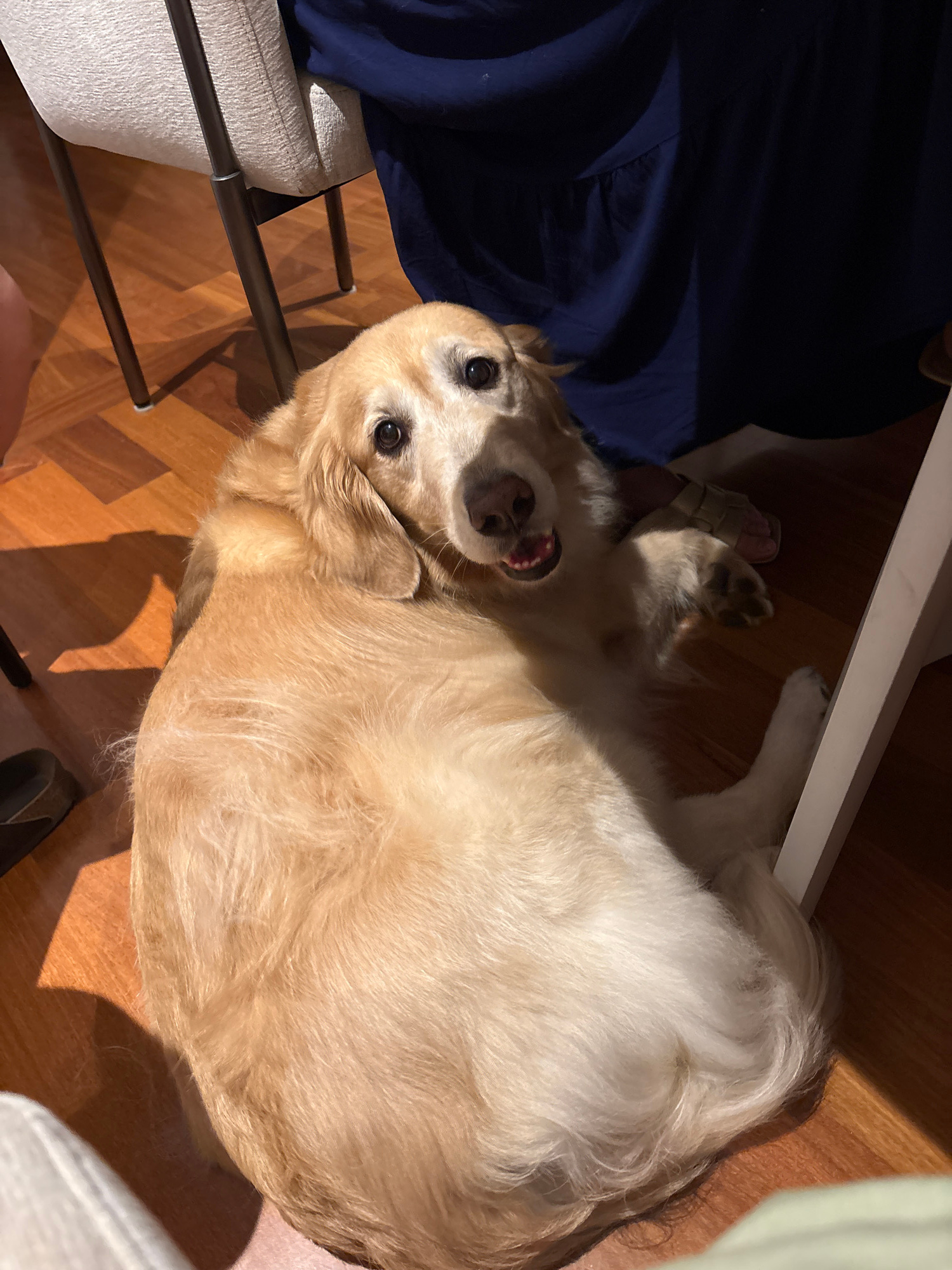 A light-colored dog, likely a Golden Retriever, is depicted lying on its back on a warm brown wooden floor, looking up towards the camera. The dog's head is tilted, and its mouth is slightly open, revβ¦read more