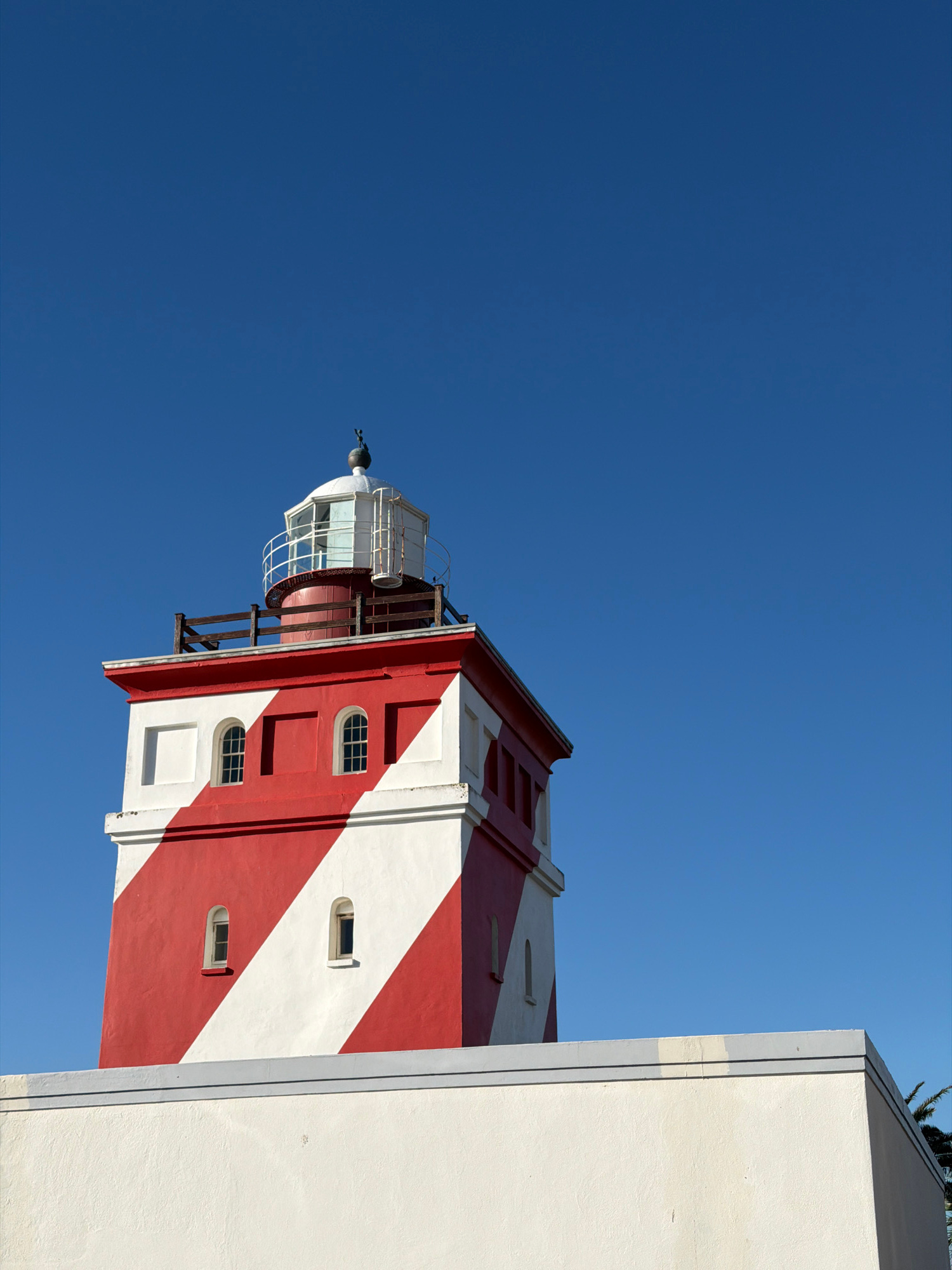 The image shows the red and white striped Milnerton Lighthouse in Cape Town, South Africa, against a clear blue sky. Part of an adjacent white building is visible on the right.