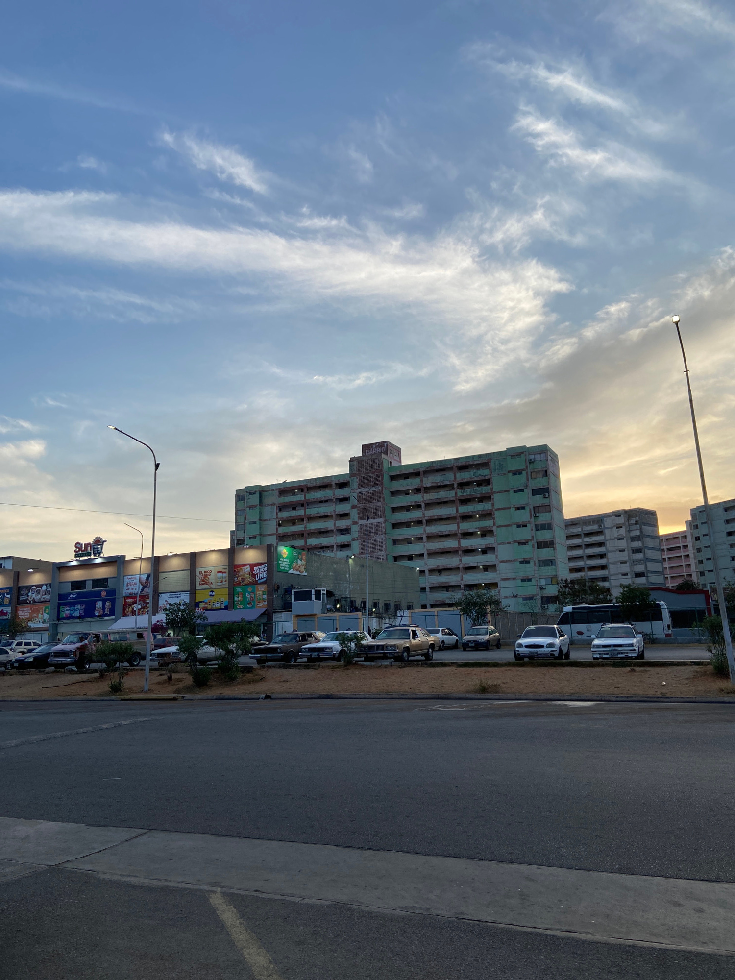 The image shows an urban scene in Juan Griego, Venezuela, at what appears to be dusk or dawn. Several tall, multi-story buildings are visible, some appearing to be residential and others commercial. T…read more