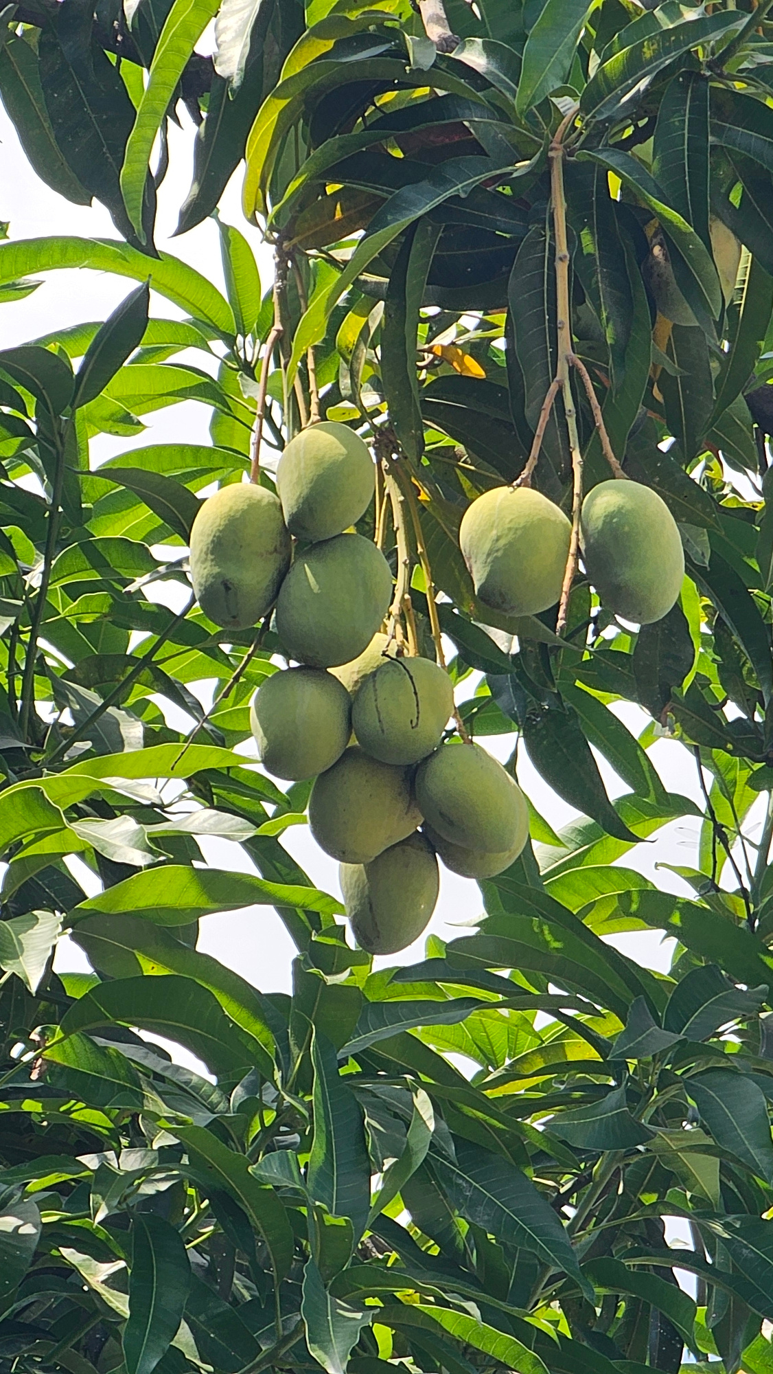 A medium, close-up shot captures a bunch of unripe, green mangoes hanging from a tree in Guayaquil, Ecuador. The mangoes are clustered together on a branch, surrounded by long, green leaves that fill…read more