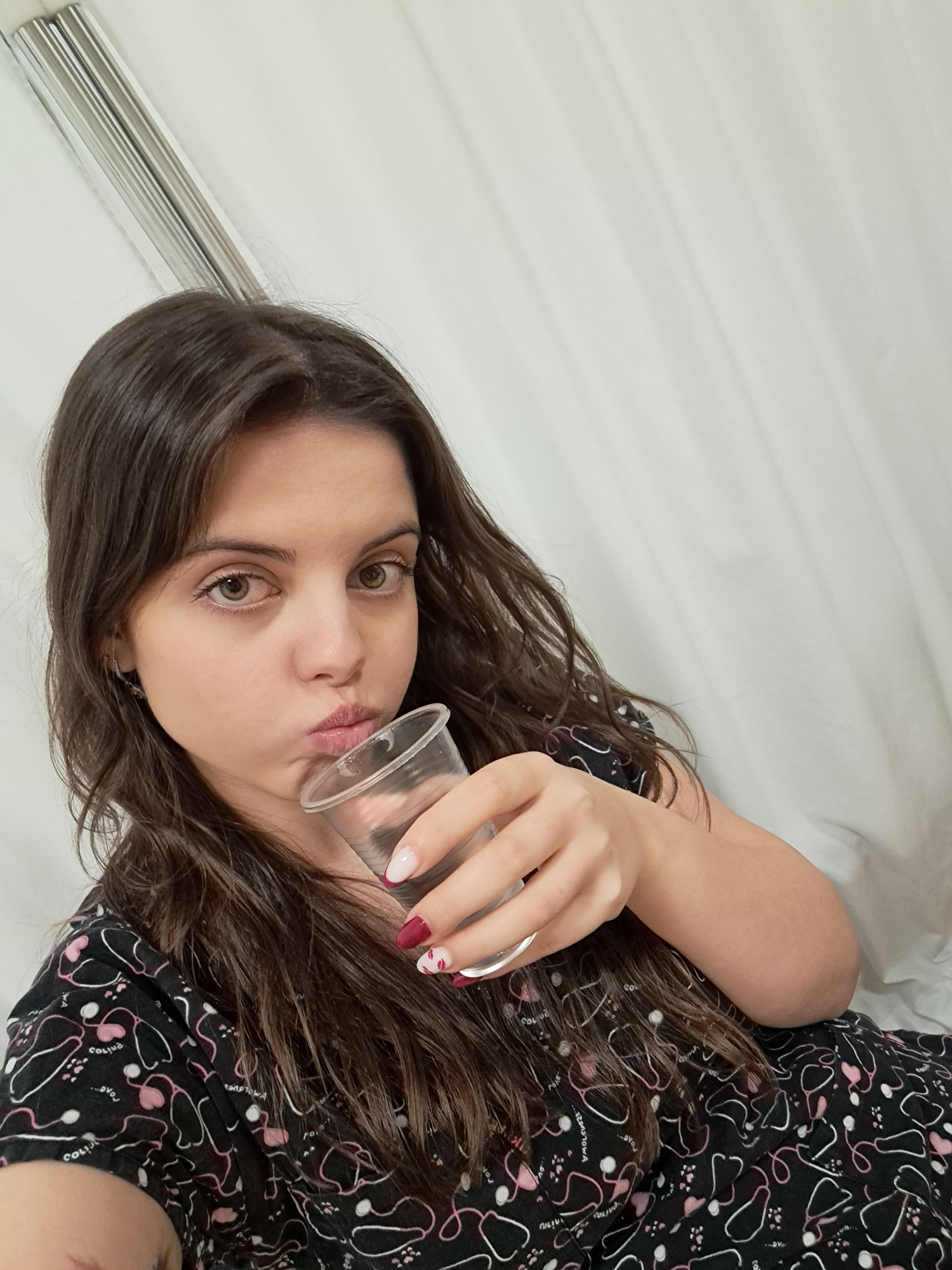 A woman with long brown hair is lying down, holding a clear plastic cup to her lips. She is wearing a black pajama top with a pattern of stethoscopes and hearts. Her nails are painted in a white and r…read more