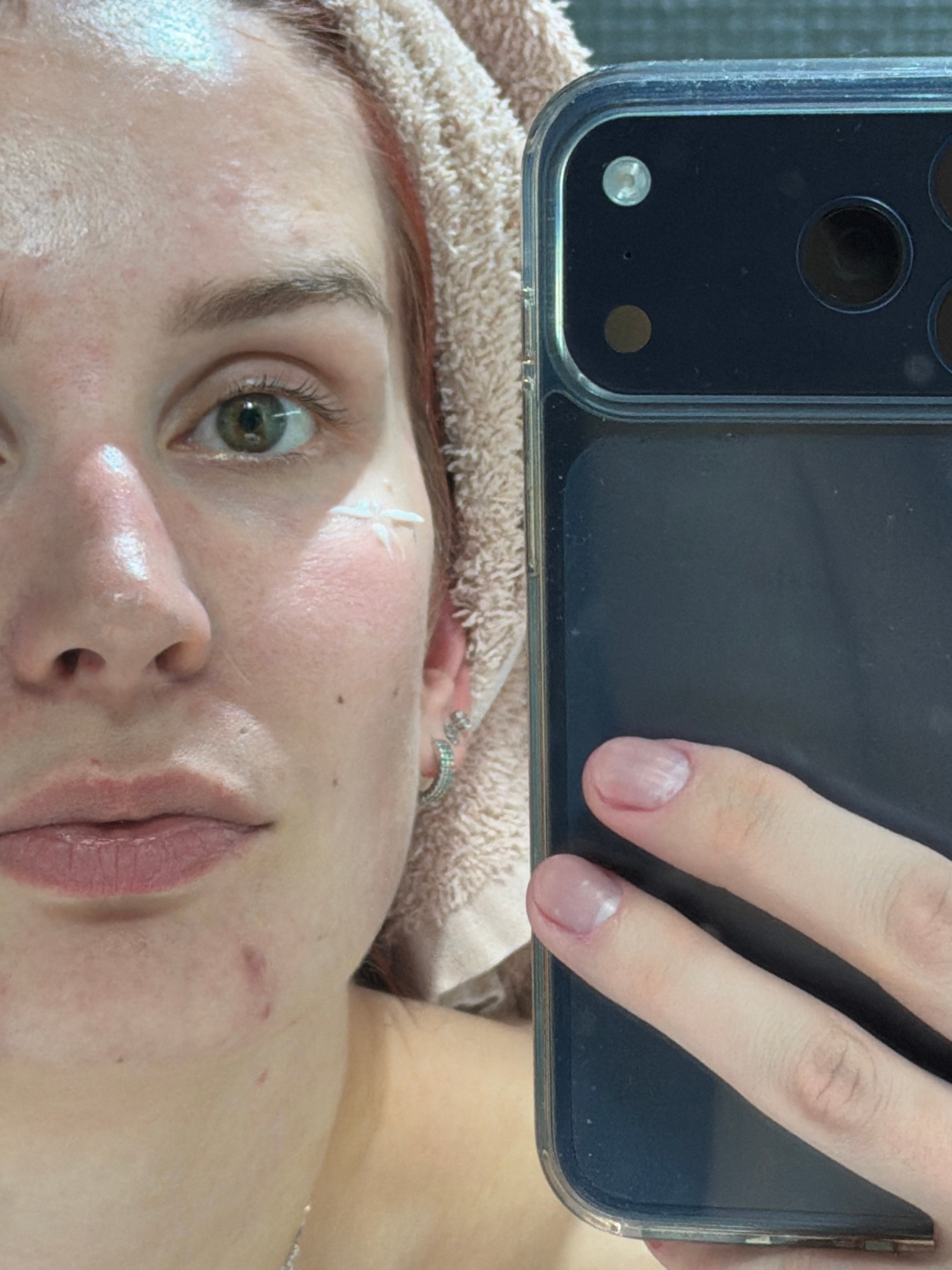 A selfie taken from above focuses on the face of a fair-skinned person with a towel wrapped around their head. A smartphone, presumably used to take the picture, obscures the upper portion of the scen…read more