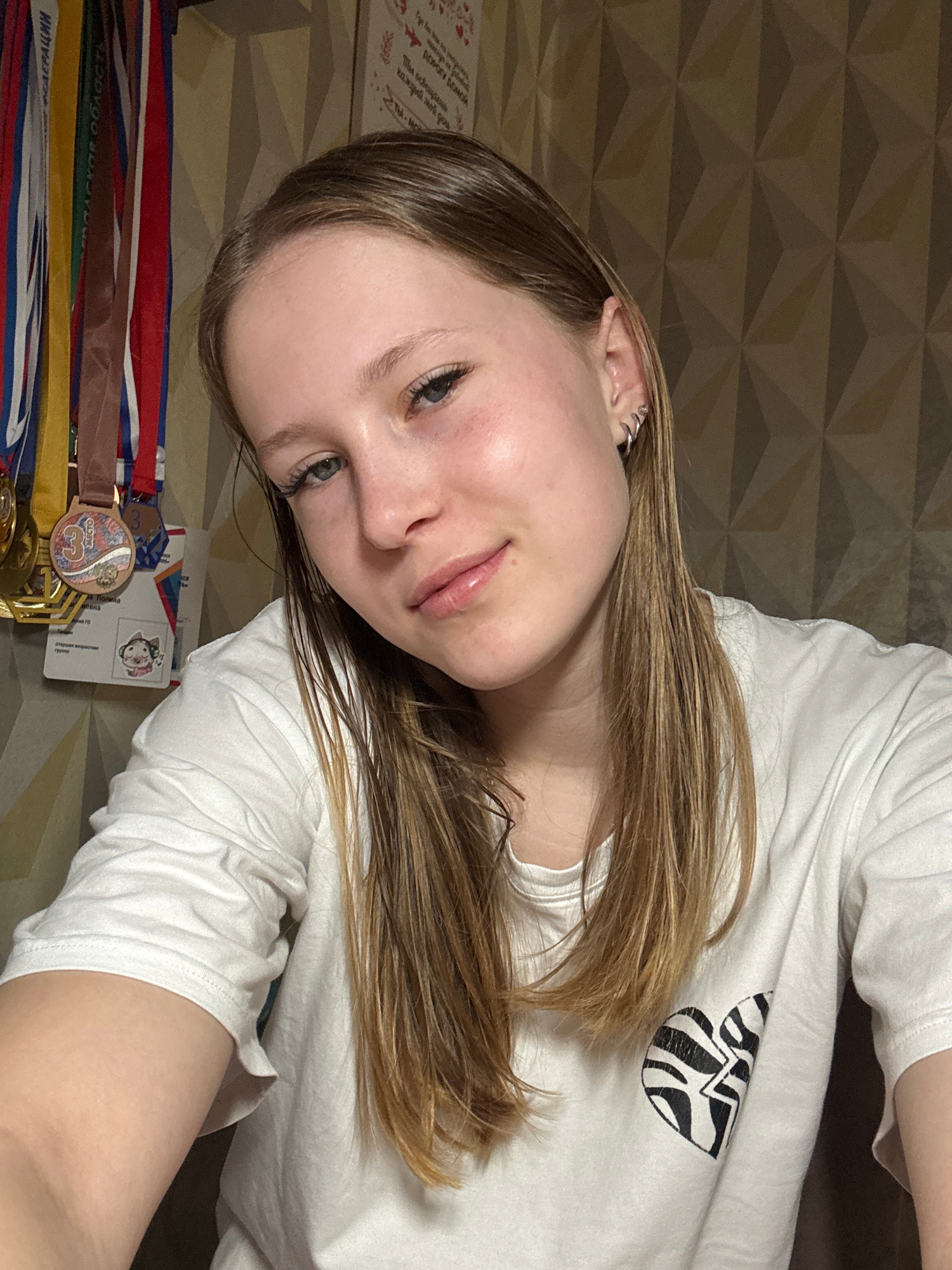 A young woman is looking at the camera and wearing a white t-shirt with a black and white zebra-striped design. She has medium-length brown hair. She appears to be indoors, with a patterned wallpaper…read more
