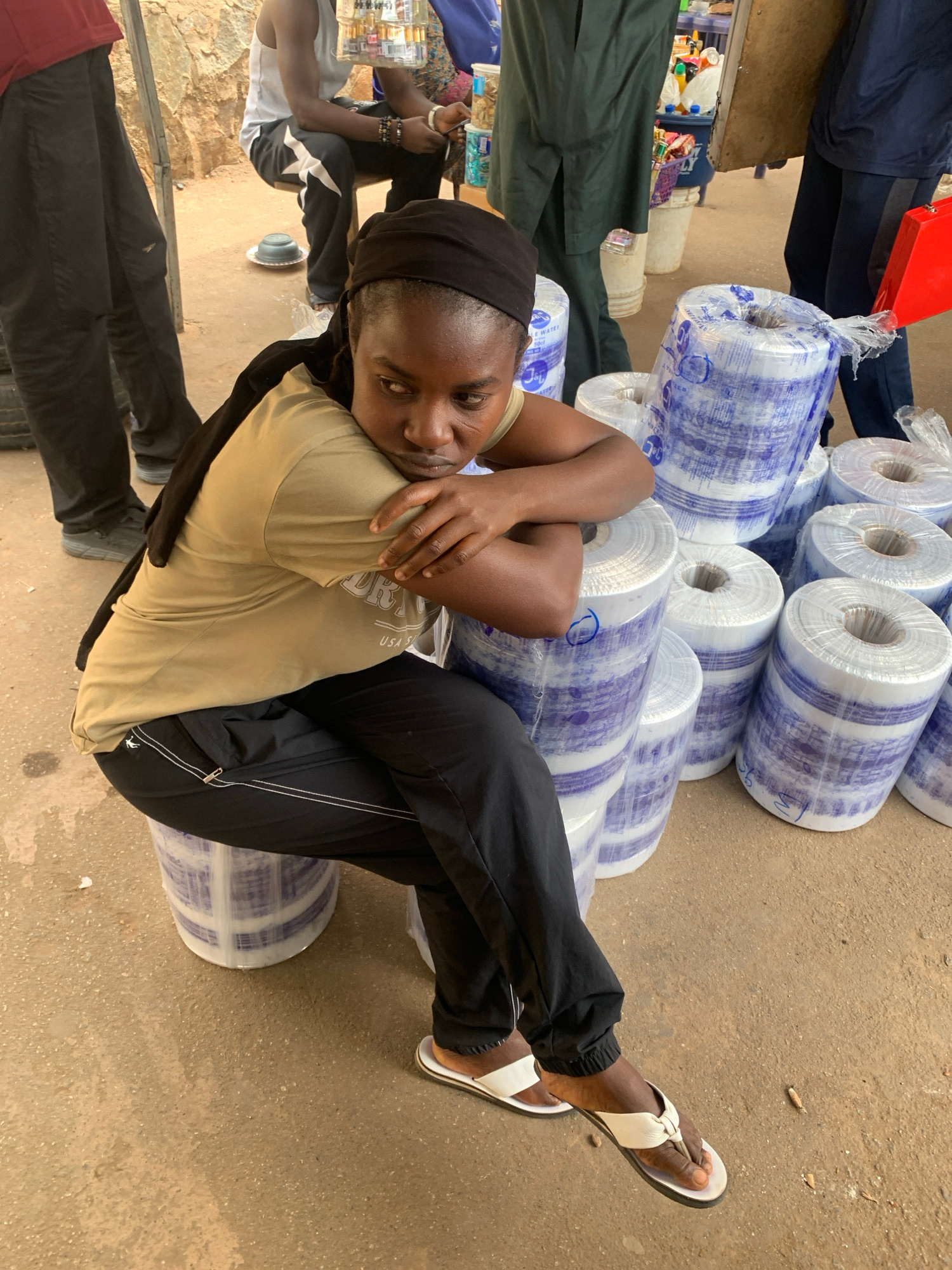 An eye-level shot depicts a person lying on a stack of plastic-wrapped rolls on a concrete surface, presumably in Bukuru, Nigeria. The person has dark skin and wears a black head covering, a tan t-shi…read more
