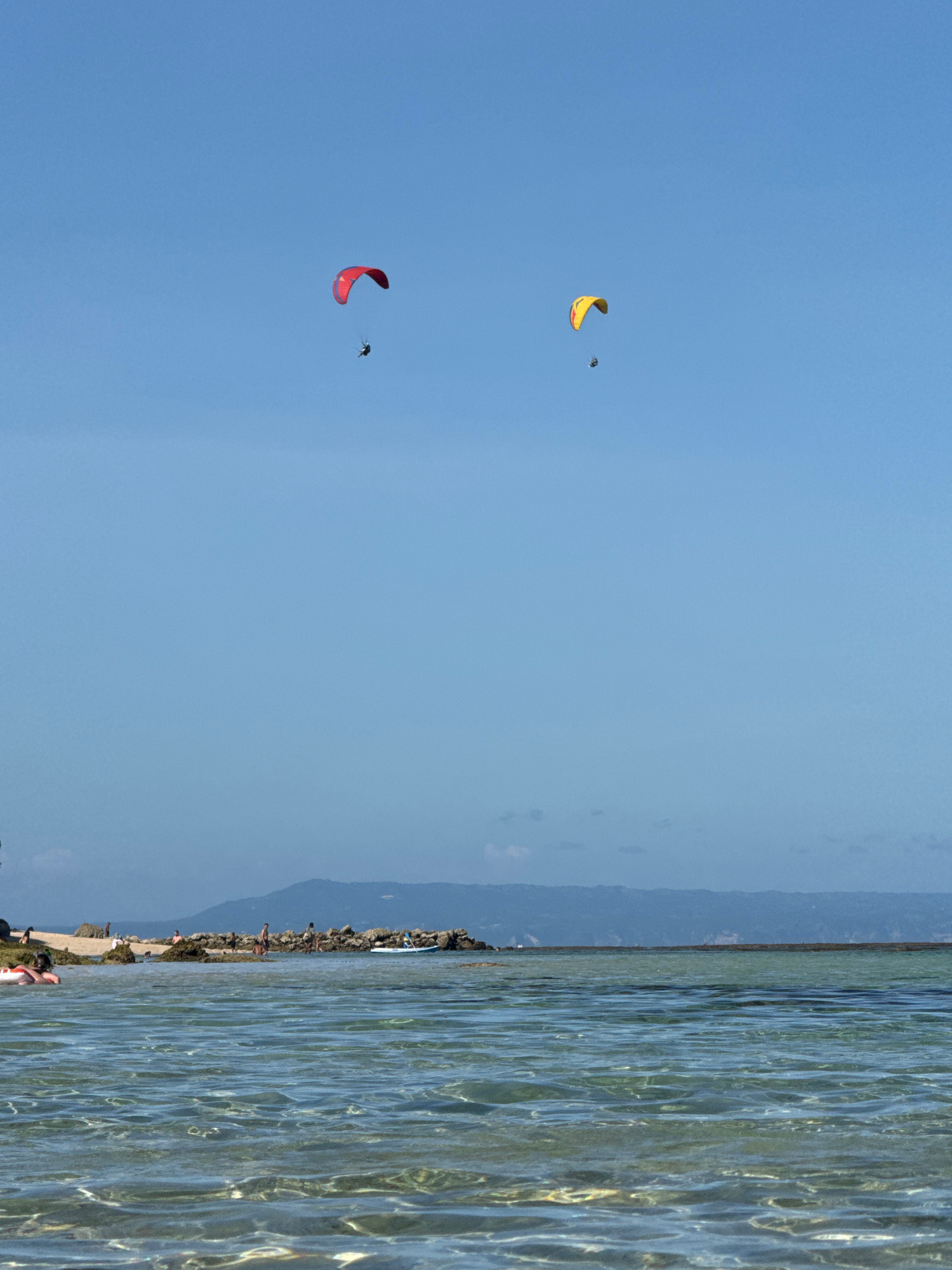 The image captures a coastal scene, likely in Kuta Selatan, Indonesia. The right side of the image showcases clear, shallow water with visible light reflections. A shoreline packed with people extends…read more