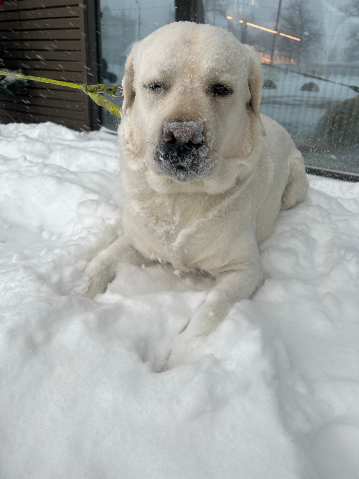 A light-colored Labrador Retriever lies in a pile of deep snow. The dog's head and snout are covered in snow, and a green leash is attached to its collar. Part of a glass door or window is visible in…read more