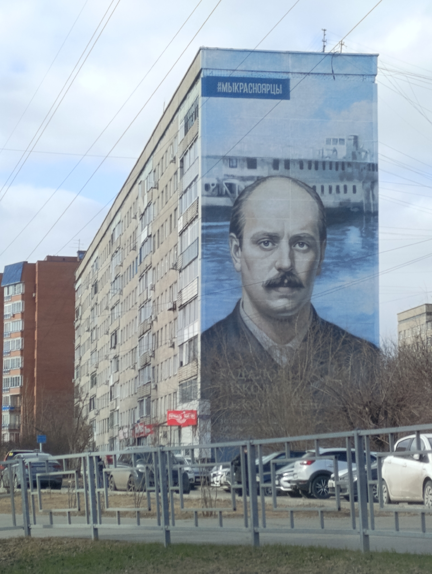 The image displays an urban scene in Krasnoyarsk, Russia, featuring a large mural on the side of a multi-story apartment building. The mural depicts a monochrome portrait of a man with a mustache and…read more