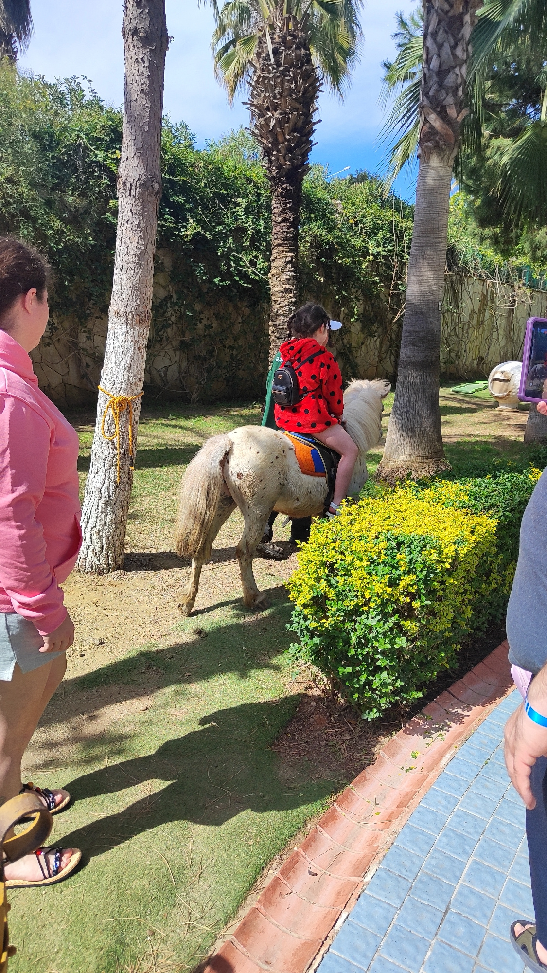 A girl wearing a red polka-dot jacket and a white baseball cap sits on a small, spotted pony. A person in a green shirt stands near the pony, possibly assisting. The pony is standing in a grassy area…read more