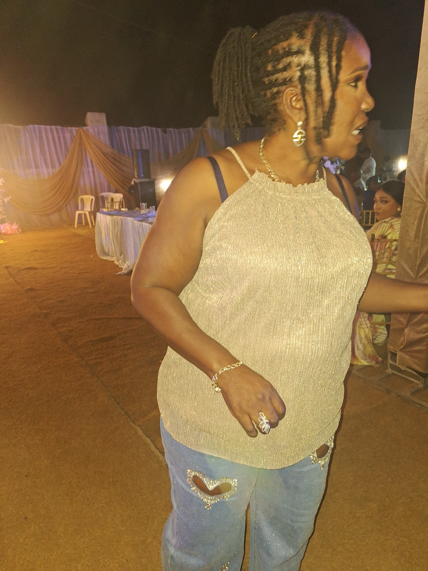 A woman with braided hair is shown from the side in an indoor environment, with decorations suggesting a celebration, possibly a wedding reception. She is wearing a light-colored top, blue jeans with…read more