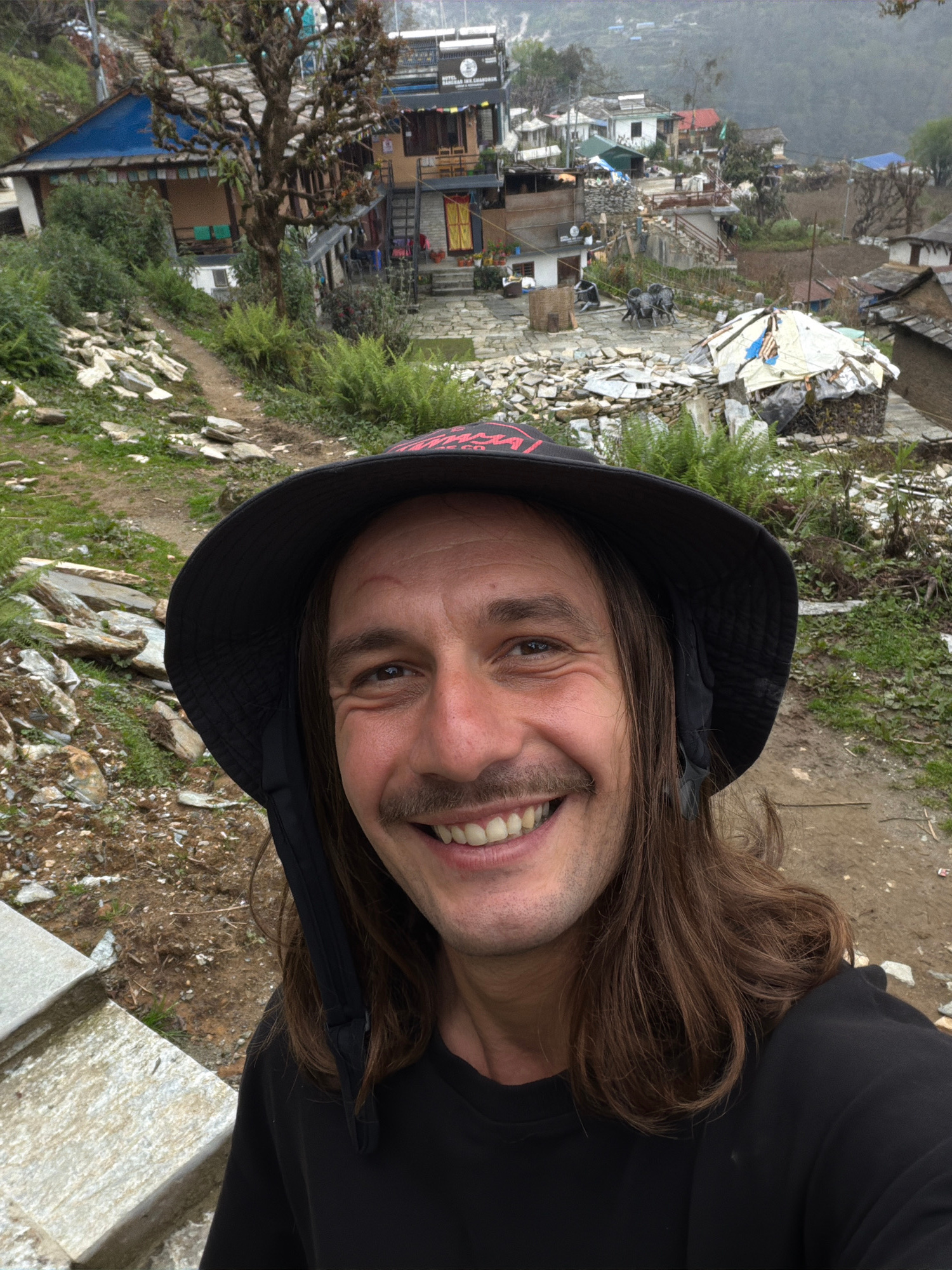 A male individual is depicted in a close-up selfie, positioned in the foreground of a scene within Purano Ghandruk, Nepal. He has light skin, long brown hair, a short mustache, and is smiling broadly,…read more