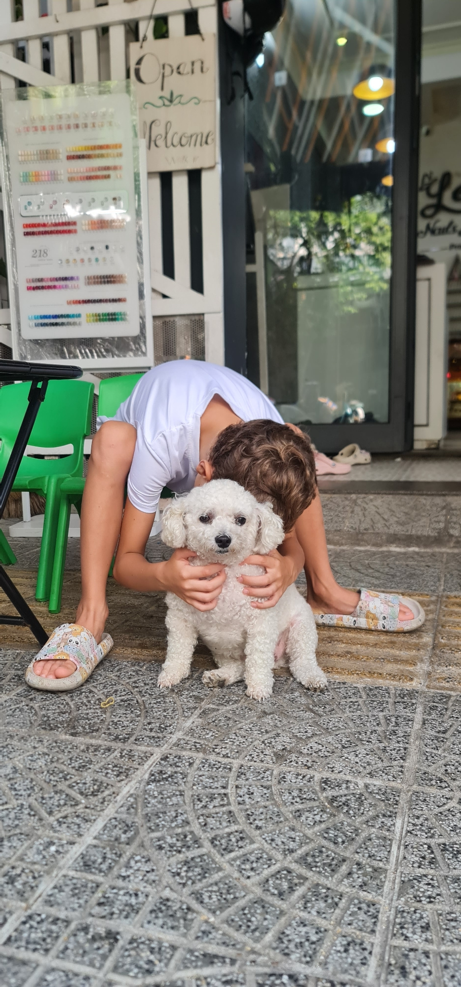 A medium shot captures a young person embracing a small white dog on a tiled outdoor area. The person, wearing a white T-shirt, sits on a bright green plastic chair. The dog, with curly white fur, is…read more