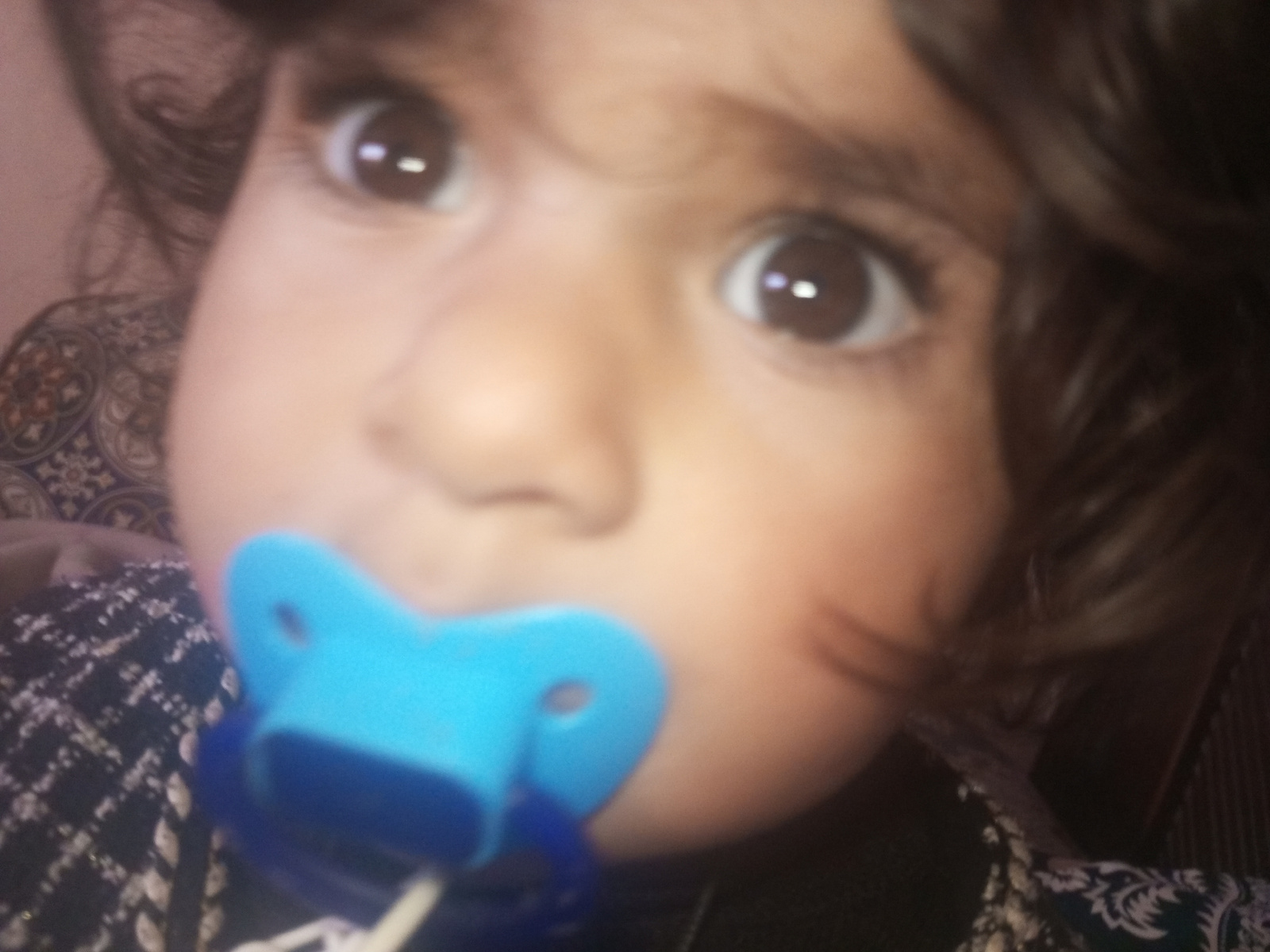 The scene depicts a close-up, front-facing view of a young child in an indeterminate indoor setting in Mansehra, Pakistan. The child, with fair skin and dark, curly hair, occupies the majority of the…read more