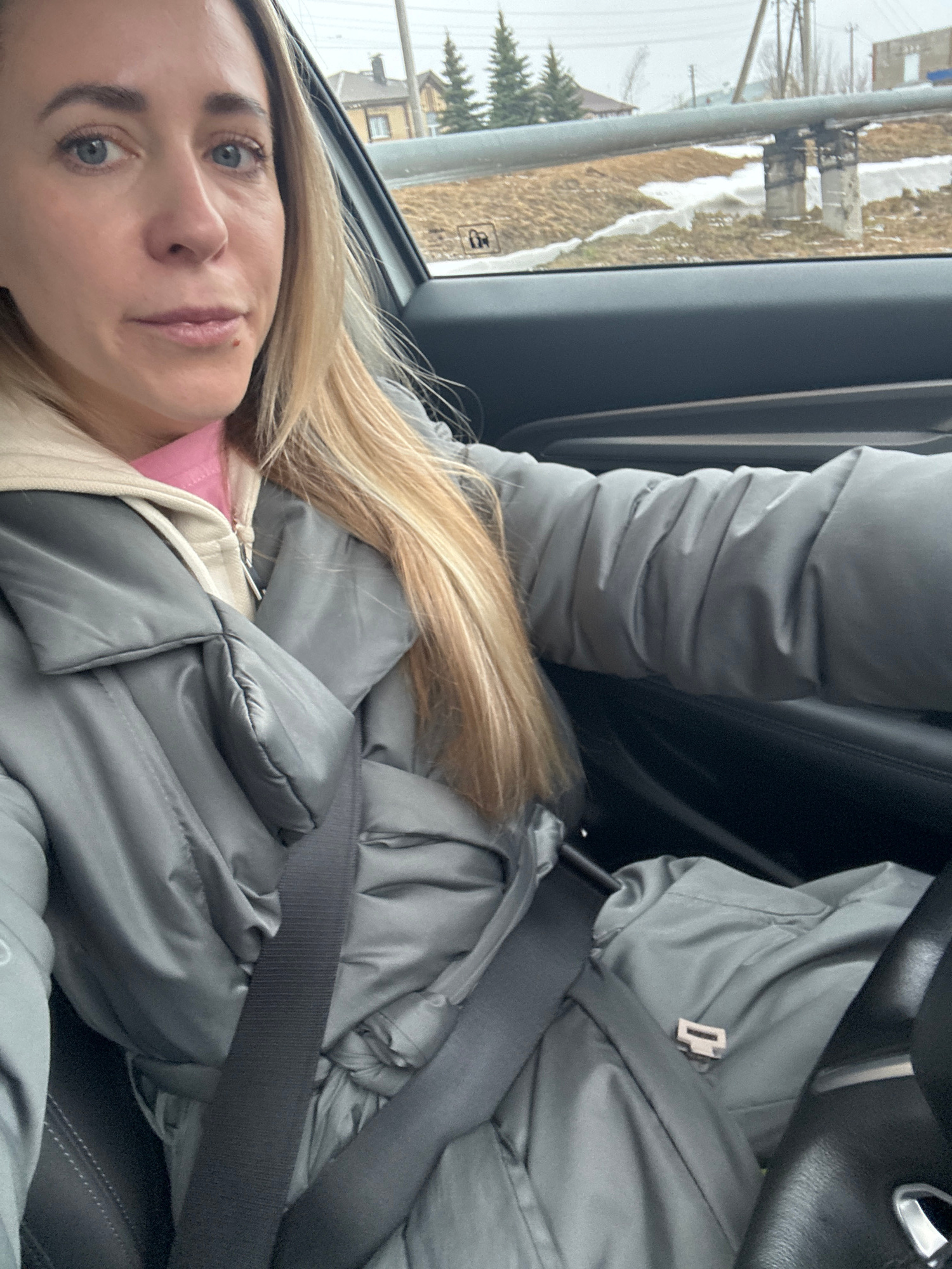 A woman is wearing a grey puffy jacket and a seatbelt in the driver's seat of a car. The car is moving. Through the window, a view of Chaikovsky, Russia is visible, including a snow-covered landscape, trees, and buildings. | Open Wire