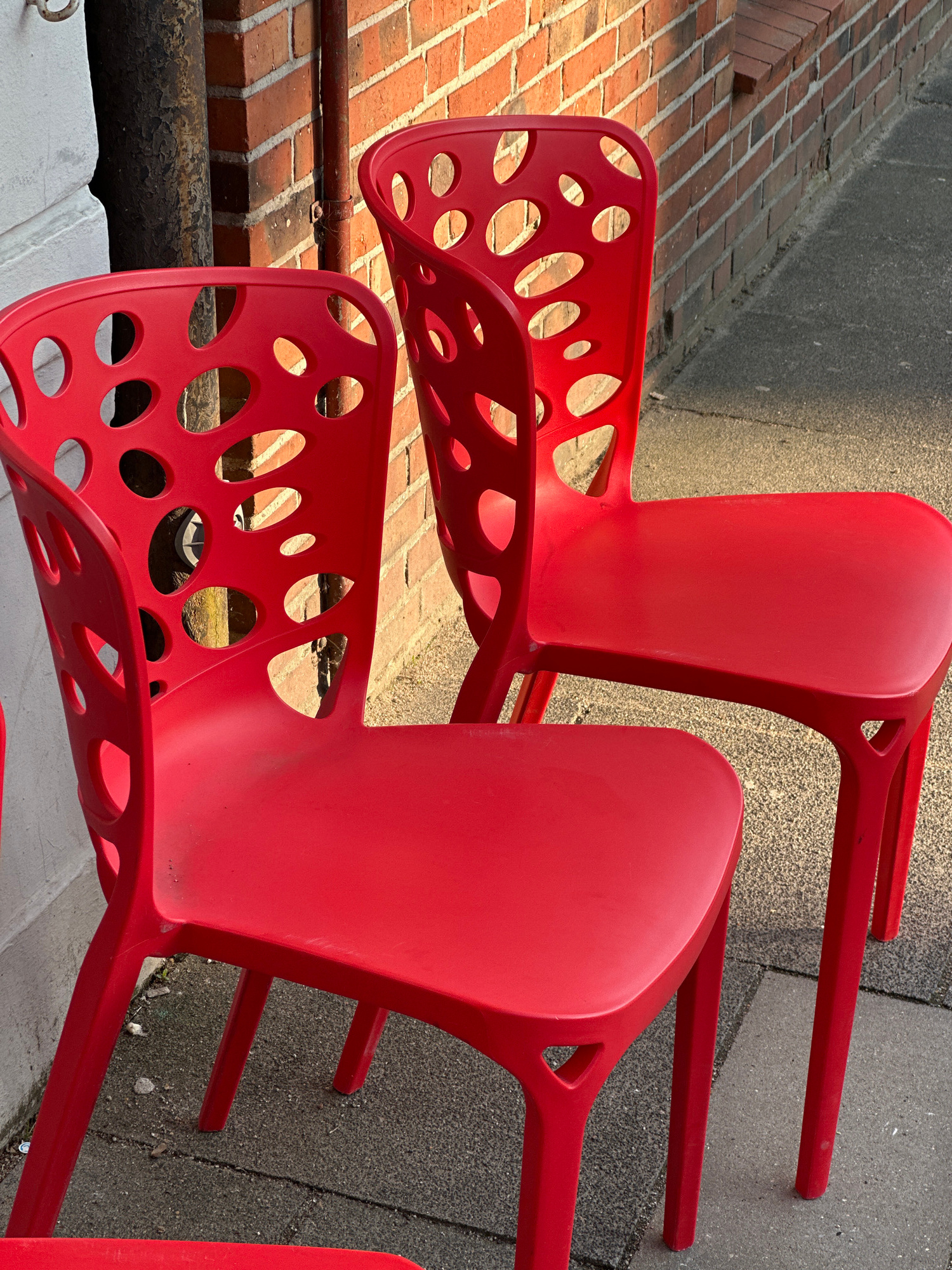 Two red plastic chairs are stacked upside down outdoors. The chairs are positioned on a concrete surface adjacent to a brick wall, suggesting an urban or semi-urban location. Given the specific instru…read more