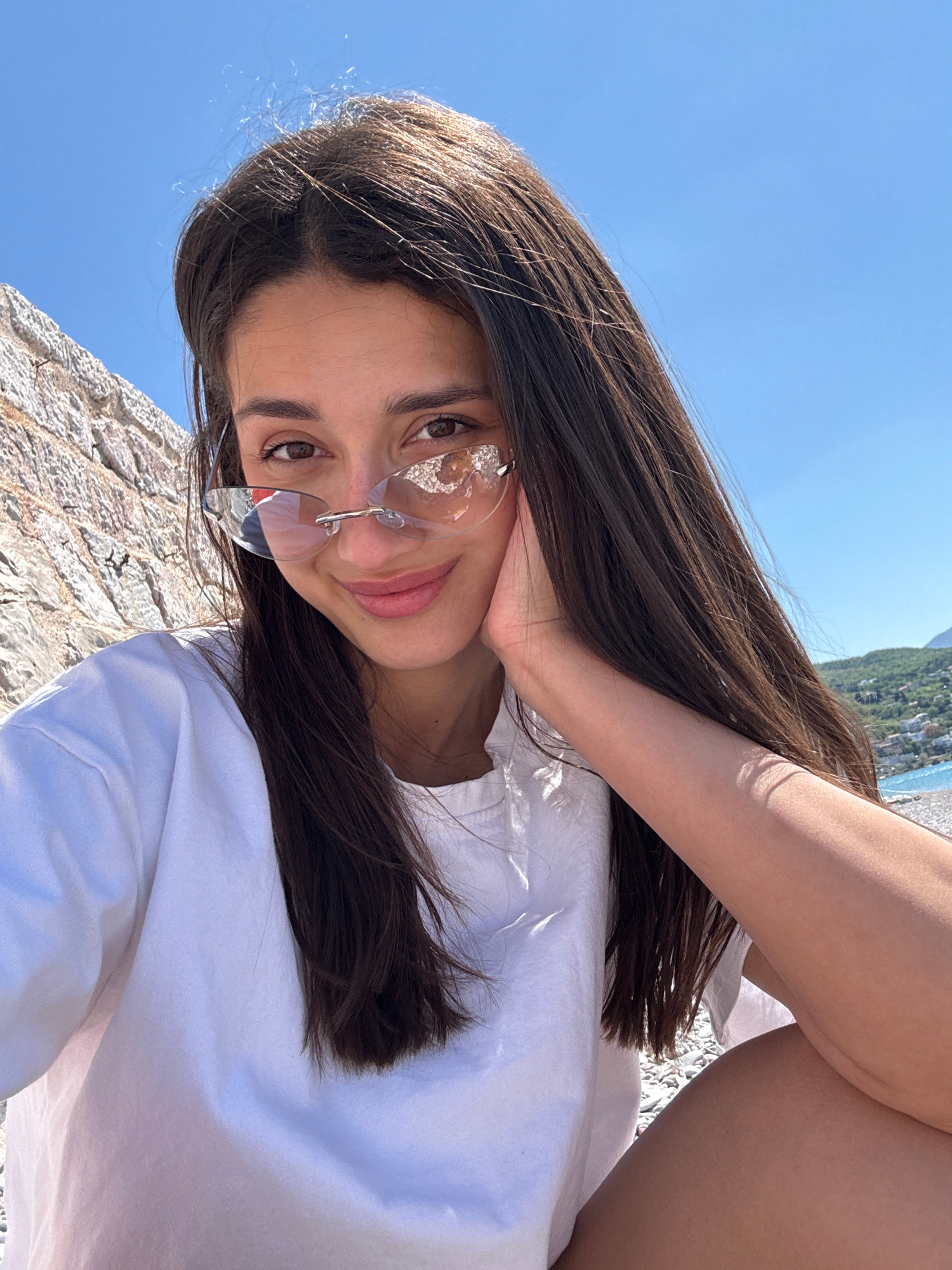 A young woman with long, dark brown hair is facing the camera while wearing frameless glasses and a white t-shirt. She is holding her hand to her face. The image is taken at an angle. The background f…read more