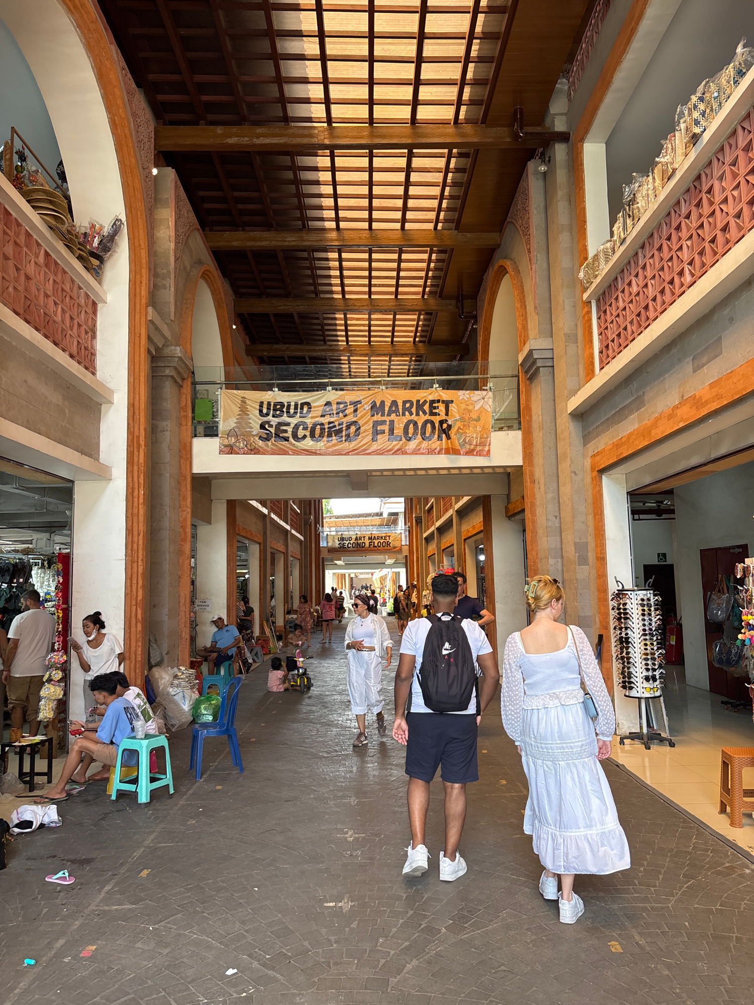 The image shows the Ubud Art Market Second Floor in the Ubud District, Indonesia. The scene depicts an indoor marketplace with vendors sitting on low stools near their wares. Shoppers, including a cou…read more