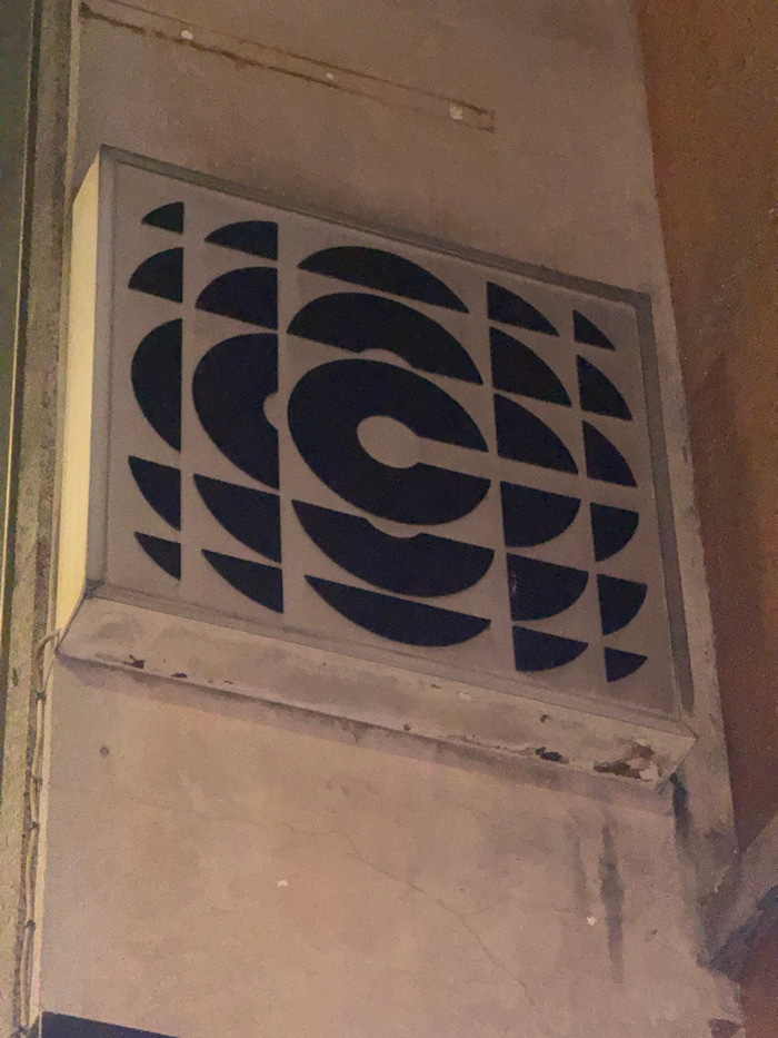 A rectangular light box, horizontally oriented, is affixed to a textured, light brown stucco wall in Milan, Italy. The light box features a black geometric pattern of semi-circular and quarter-circula…read more
