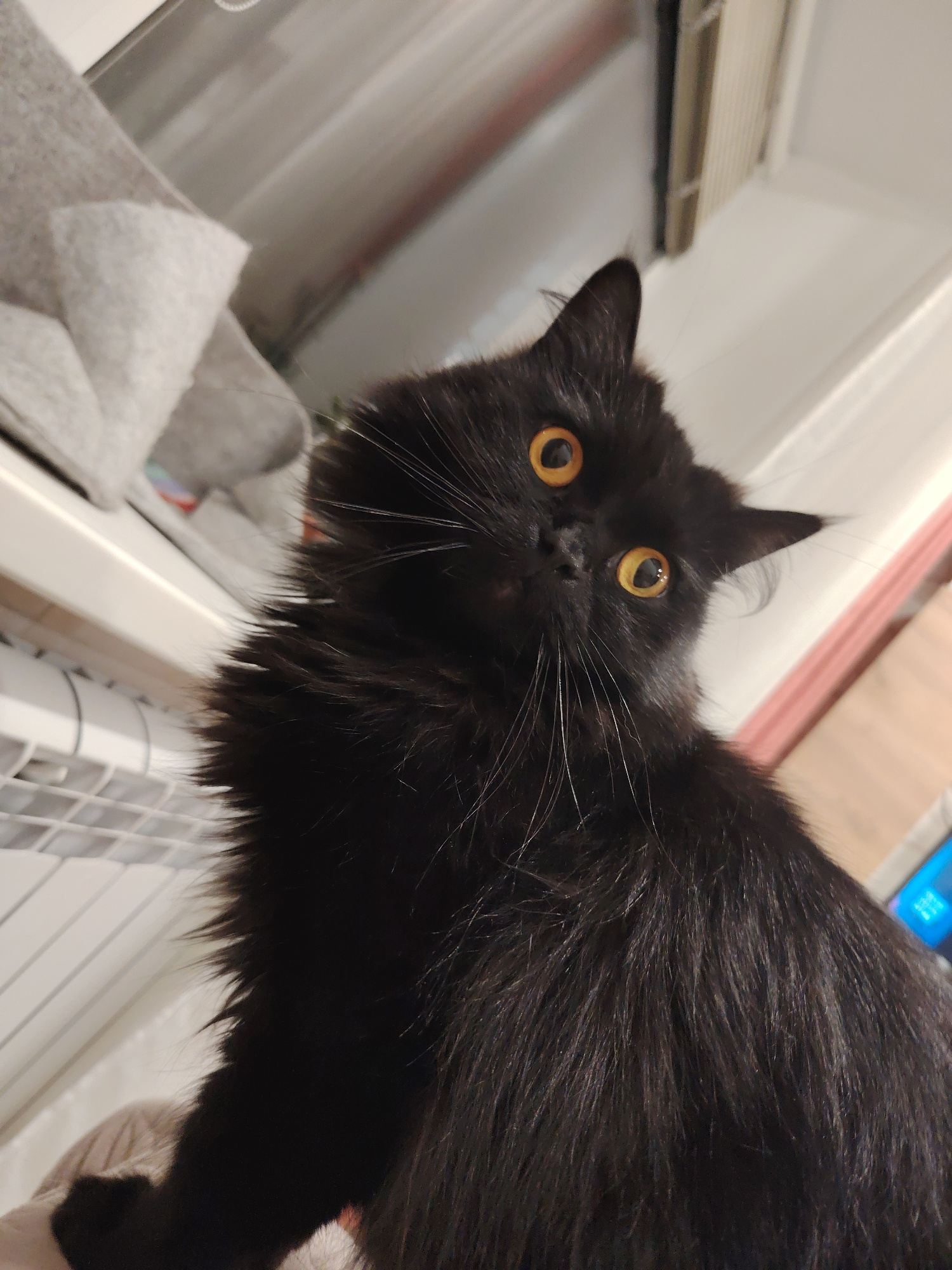 A medium shot shows a black cat with yellow eyes looking directly at the camera. The cat is positioned in the lower center of the frame, with its head tilted slightly to the left. The background inclu…read more