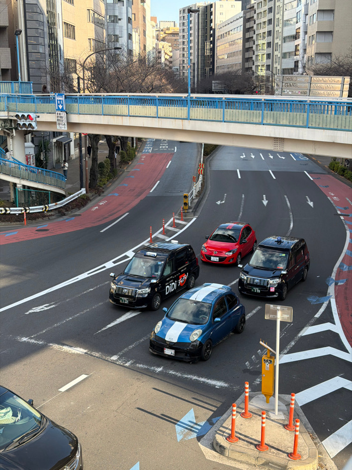 Four cars occupy a winding road. Two black taxis, a red Mazda, and a blue striped car are grouped near a painted island with orange traffic cones. A road sign is visible to the left, with buildings in…read more