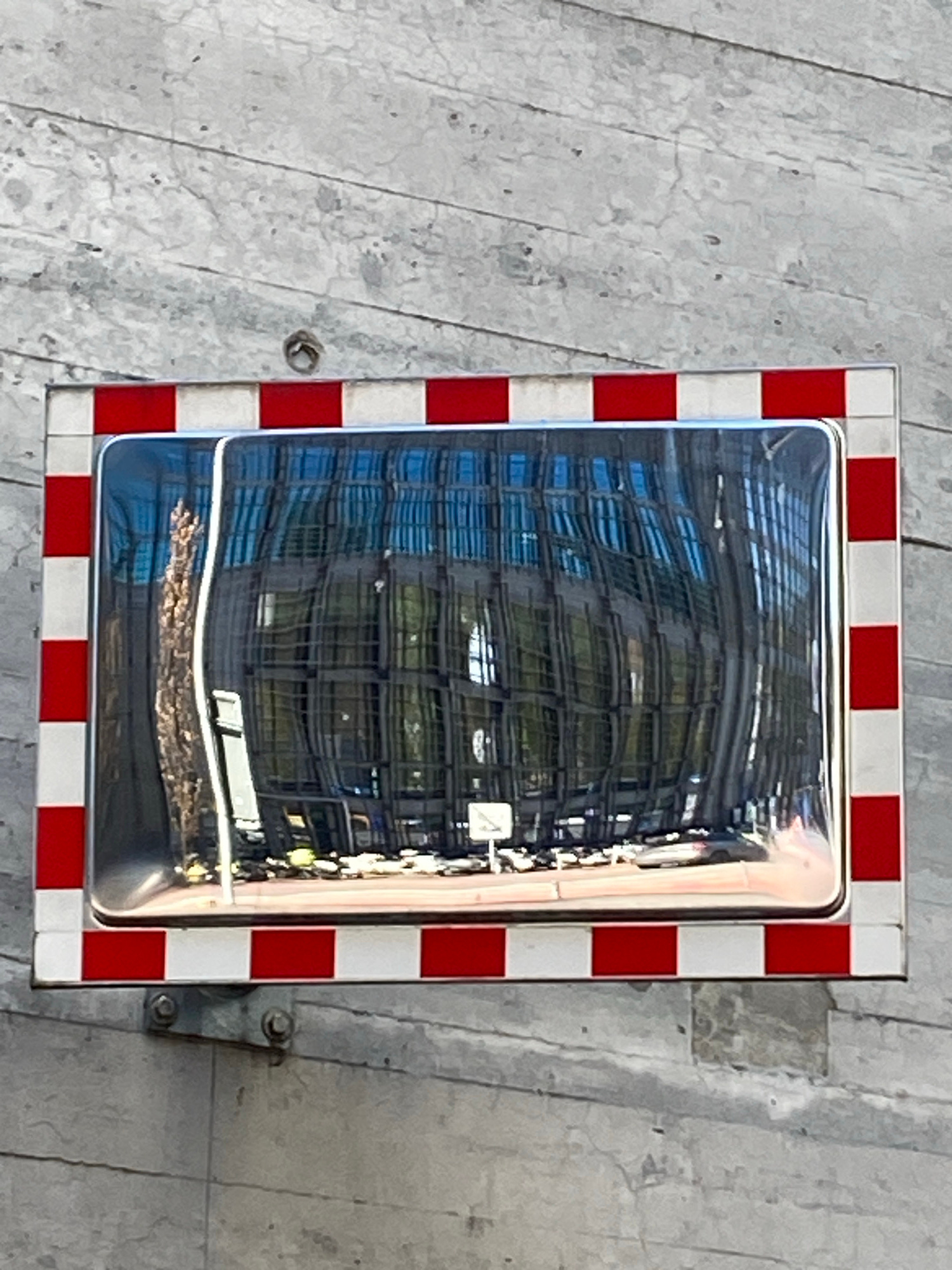A rectangular mirror with a red and white checkered border is mounted on a gray concrete wall. The mirror reflects a modern office building with a curved facade, suggesting a downtown or business dist…read more