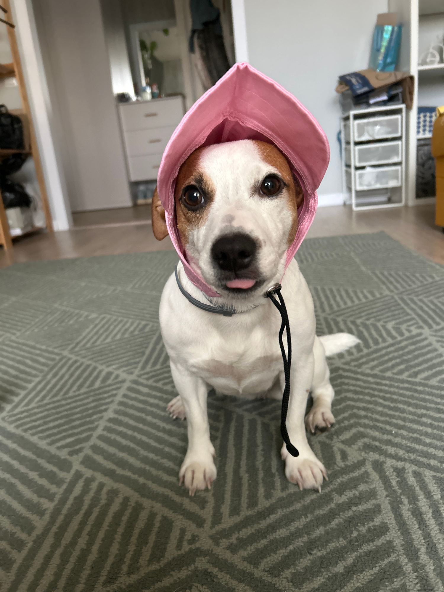 A white and brown spotted dog, likely a Jack Russell Terrier, is prominently featured in this indoor photograph. The dog is lying or sitting on a grey carpet with a repeating geometric pattern of diag…read more
