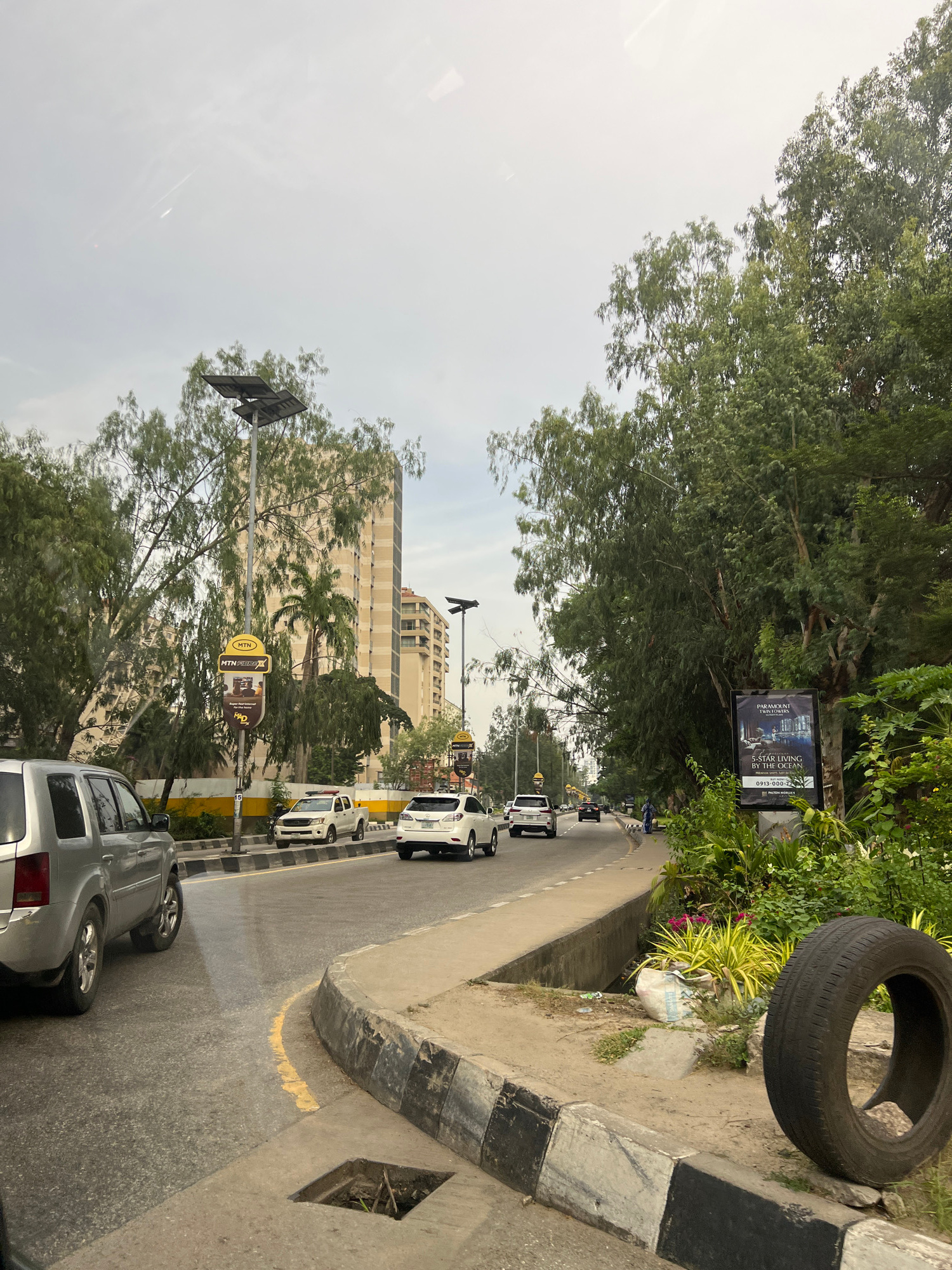 The image depicts a street scene in Falomo, Nigeria. The road curves gently and is lined with parked cars. A large, partially visible building stands in the background. Street signage and advertisemen…read more