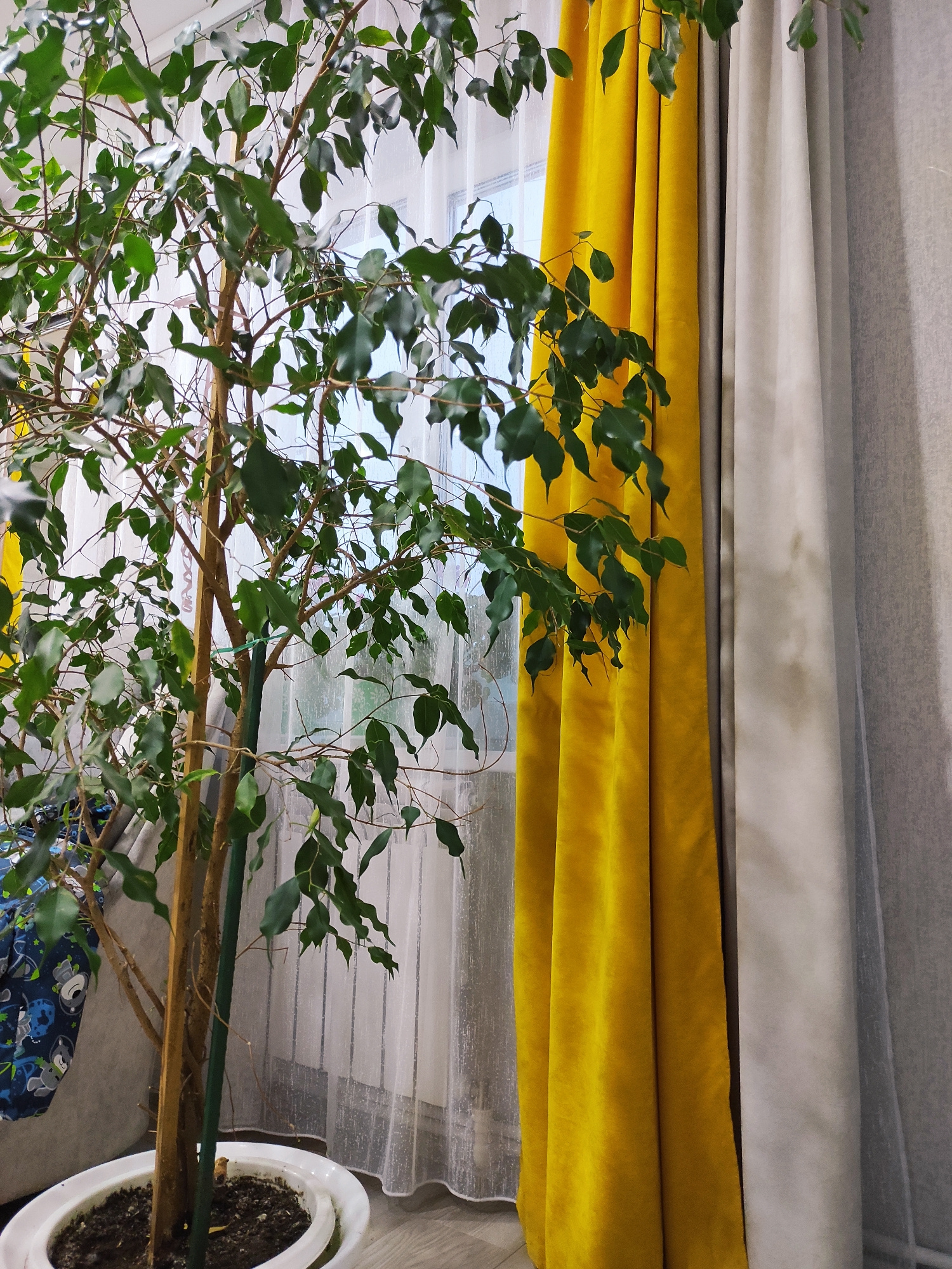 The image depicts a potted ficus tree in front of a window with layered curtains. The curtains are arranged in tiers: gray at the top, yellow in the middle, and a sheer white layer closest to the wind…read more