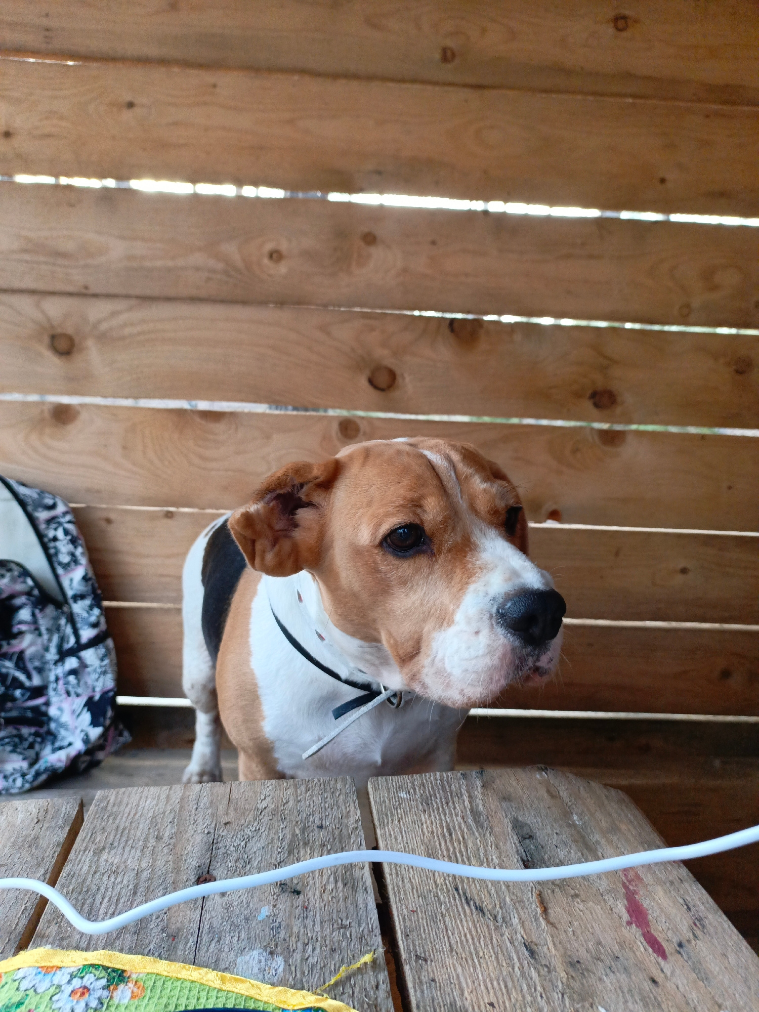 The image shows a dog with brown and white fur, wearing a black collar, standing behind a wooden table inside what appears to be a wooden structure. A backpack with a floral pattern is to the left of…read more