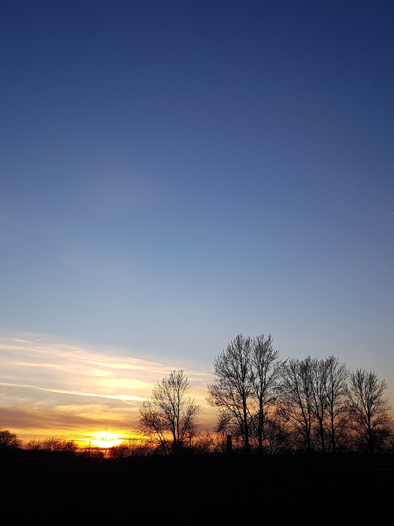 The image shows a sunset scene, with the sky transitioning from a deep blue to a light orange-yellow gradient where the sun is setting. Silhouetted trees are visible against the sunset. The exact loca…read more