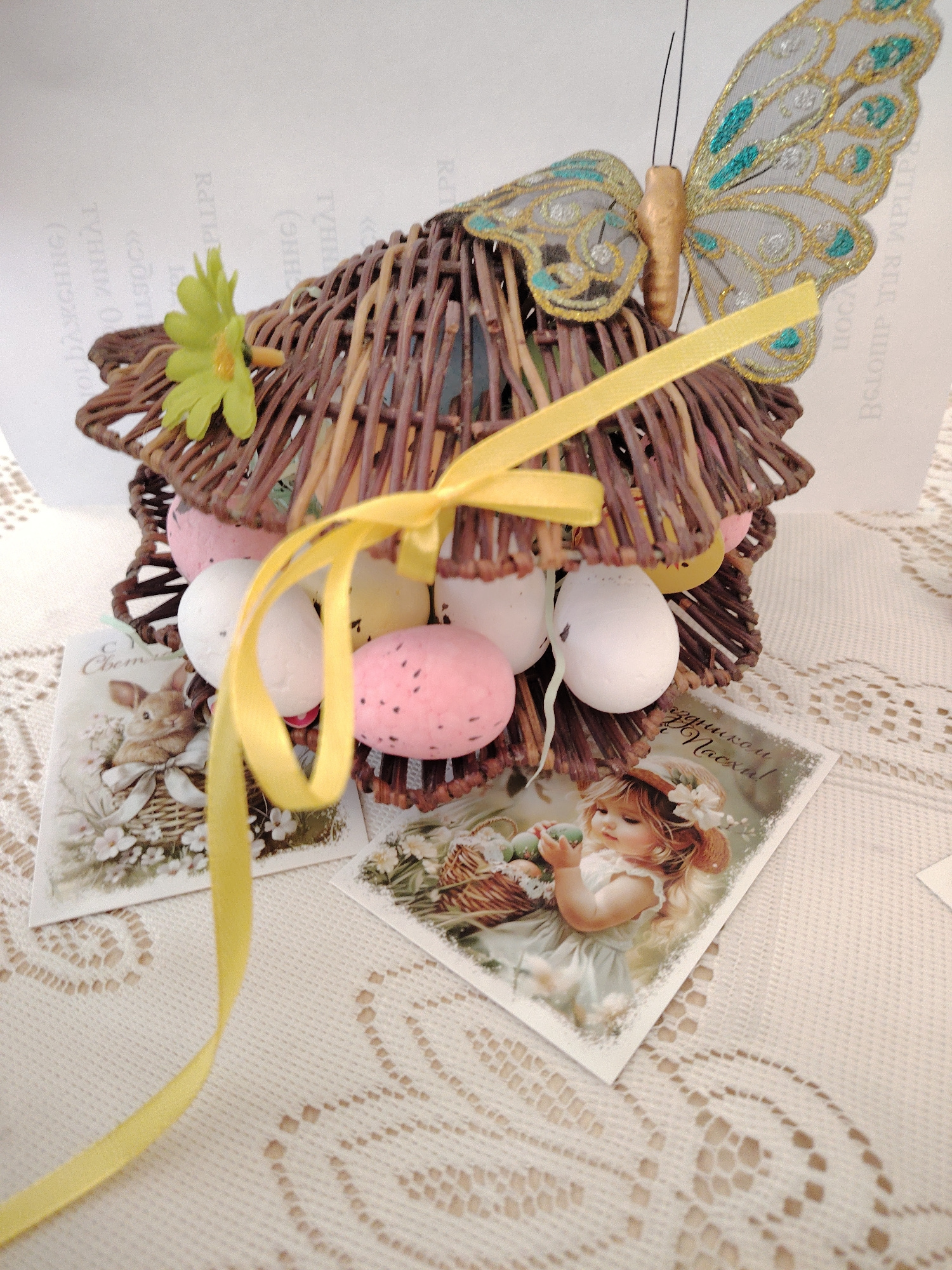 The image shows a decorative Easter basket. The basket is made of woven twigs and is decorated with a yellow ribbon, a green flower, and a butterfly. The basket contains several Easter eggs, some white and some pink with dark spots. Two postcards are in front of the basket, one with a rabbit and the other with a young girl holding a basket. The scene is set on a lacy tablecloth. The background is out of focus. It is unknown if this image was taken in Sarapul, Russia. | Open Wire