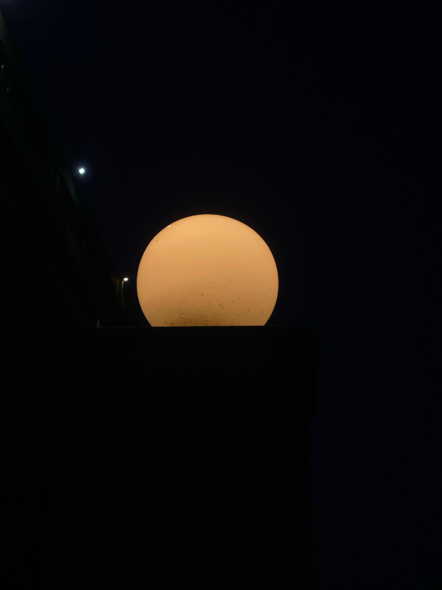 A low-angle, nighttime view shows a large, illuminated globe-shaped lamp partially obscured by a dark, rectangular structure on the right. A smaller light source is visible below and to the left of th…read more