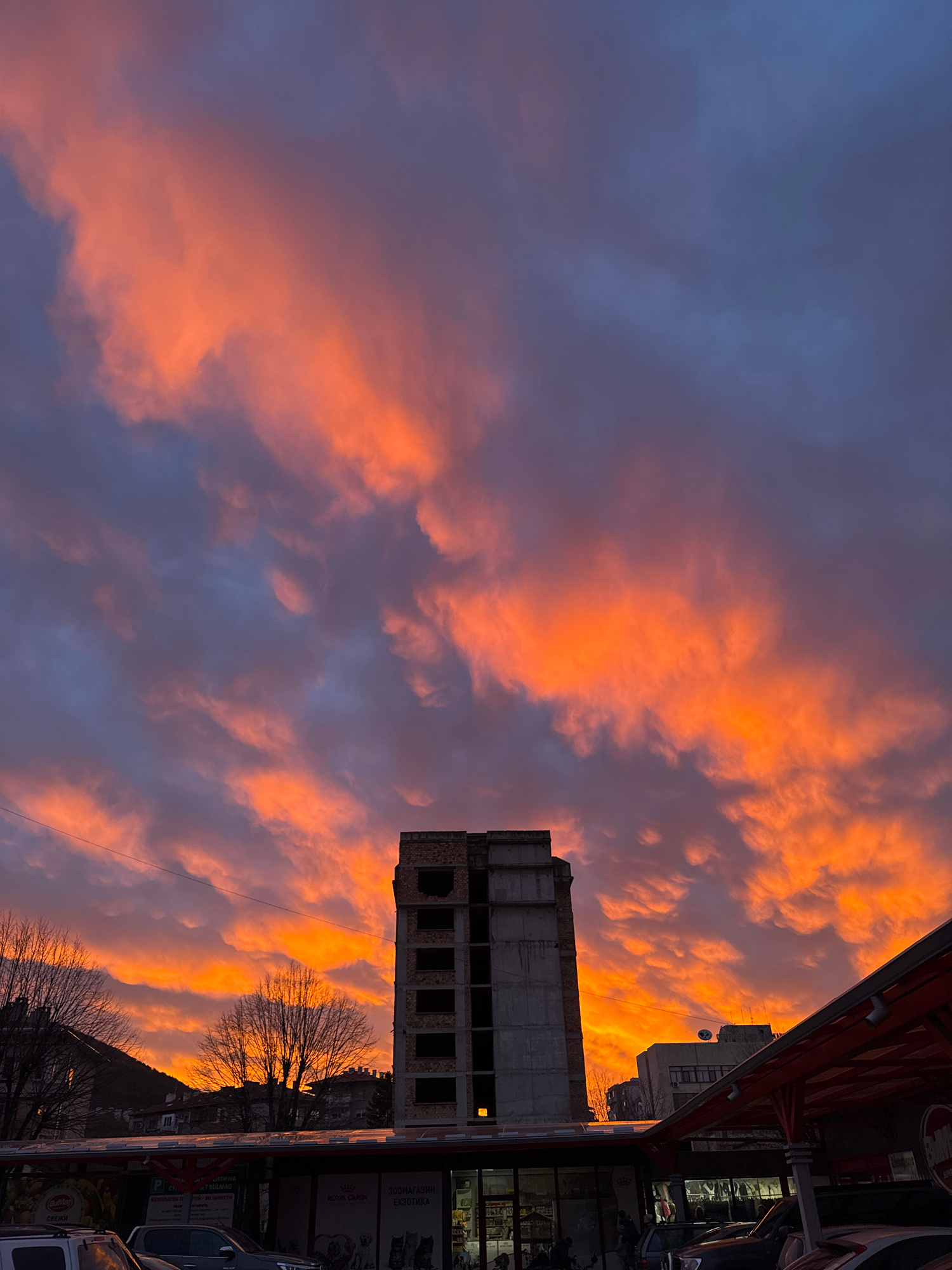 The image captures a vivid sunset sky over what appears to be a building under construction in Shumen, Bulgaria. The sky is a mix of orange and blue clouds, brightly illuminated by the setting sun. Be…read more