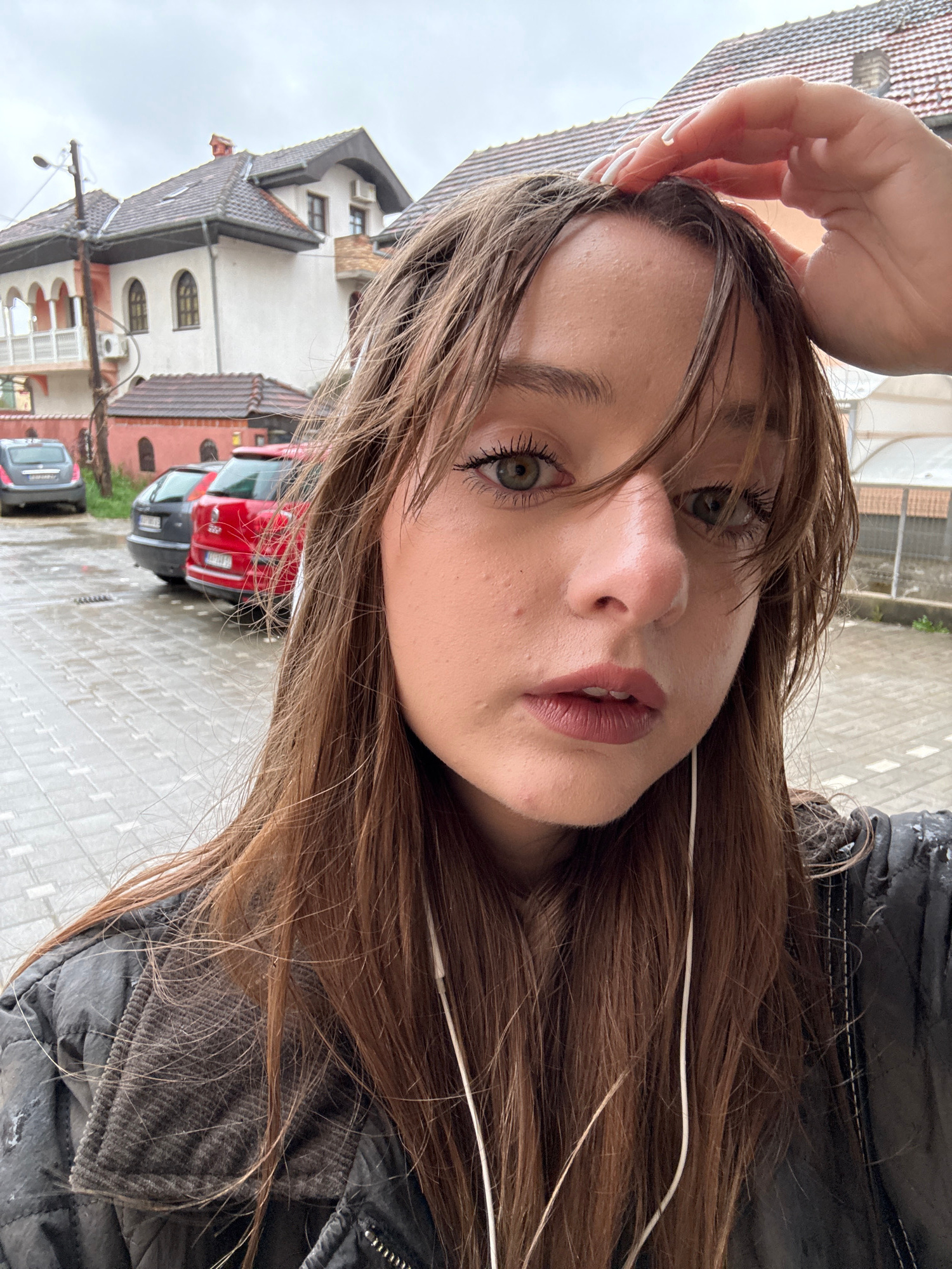 A selfie-style image of a young woman with brown hair, wearing a black jacket and white earphones. The photo is taken at an angle, showing part of a residential street in Kragujevac, Serbia. In the ba…read more